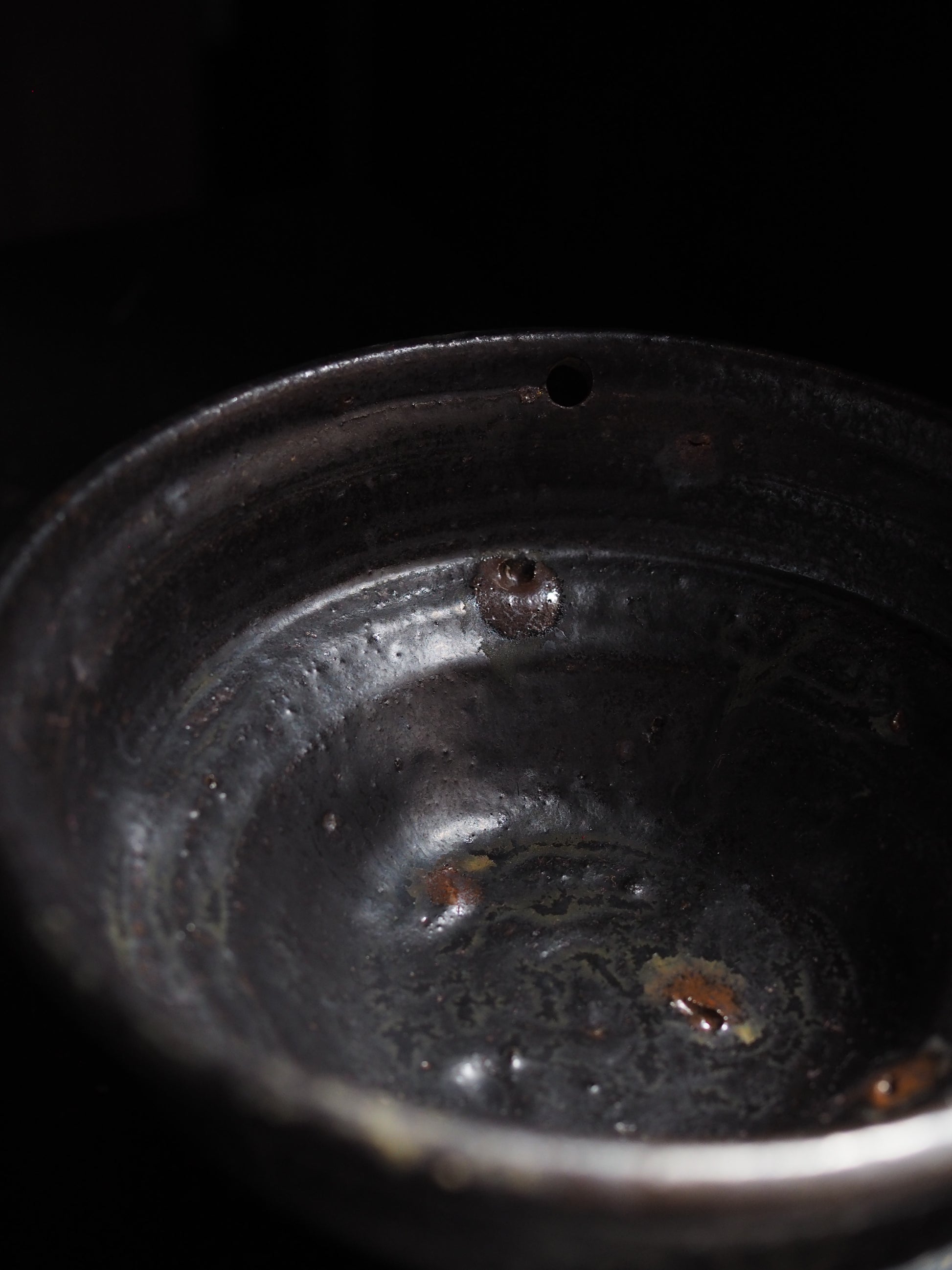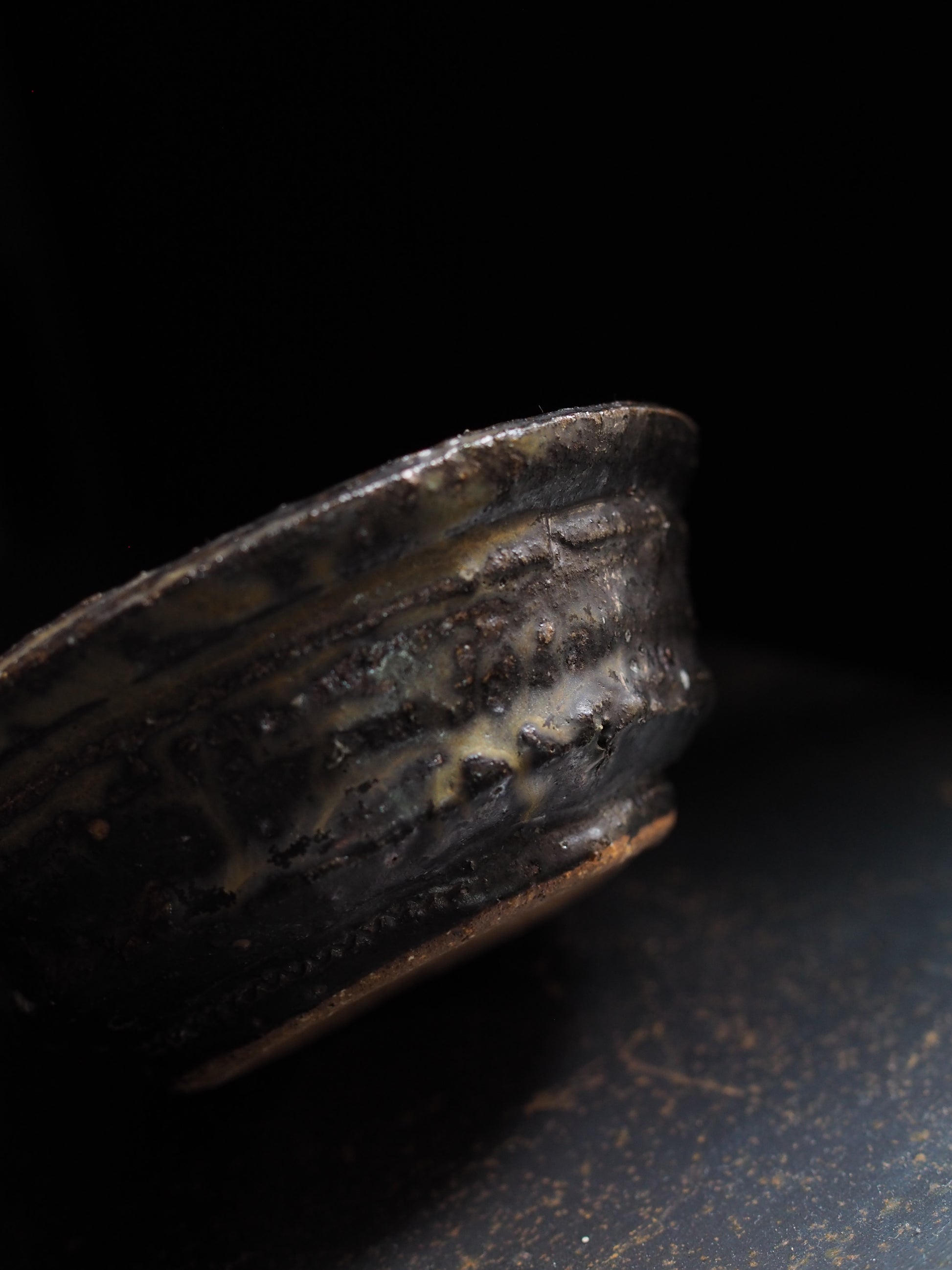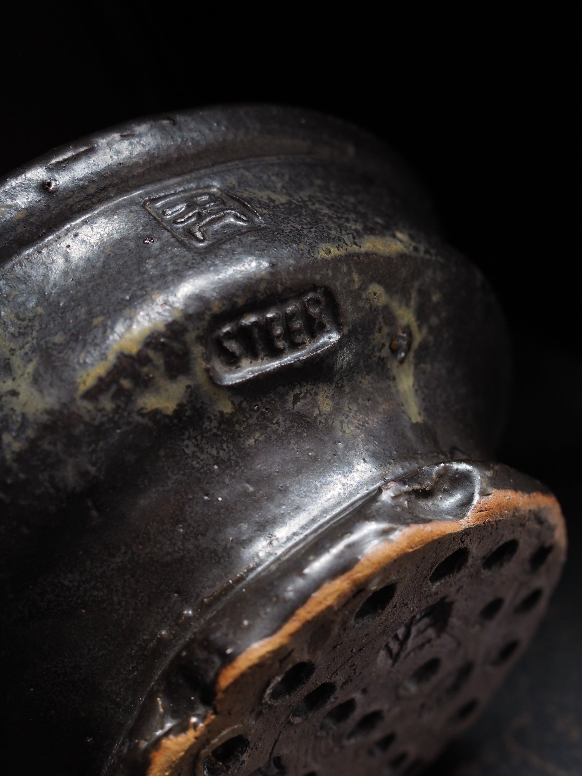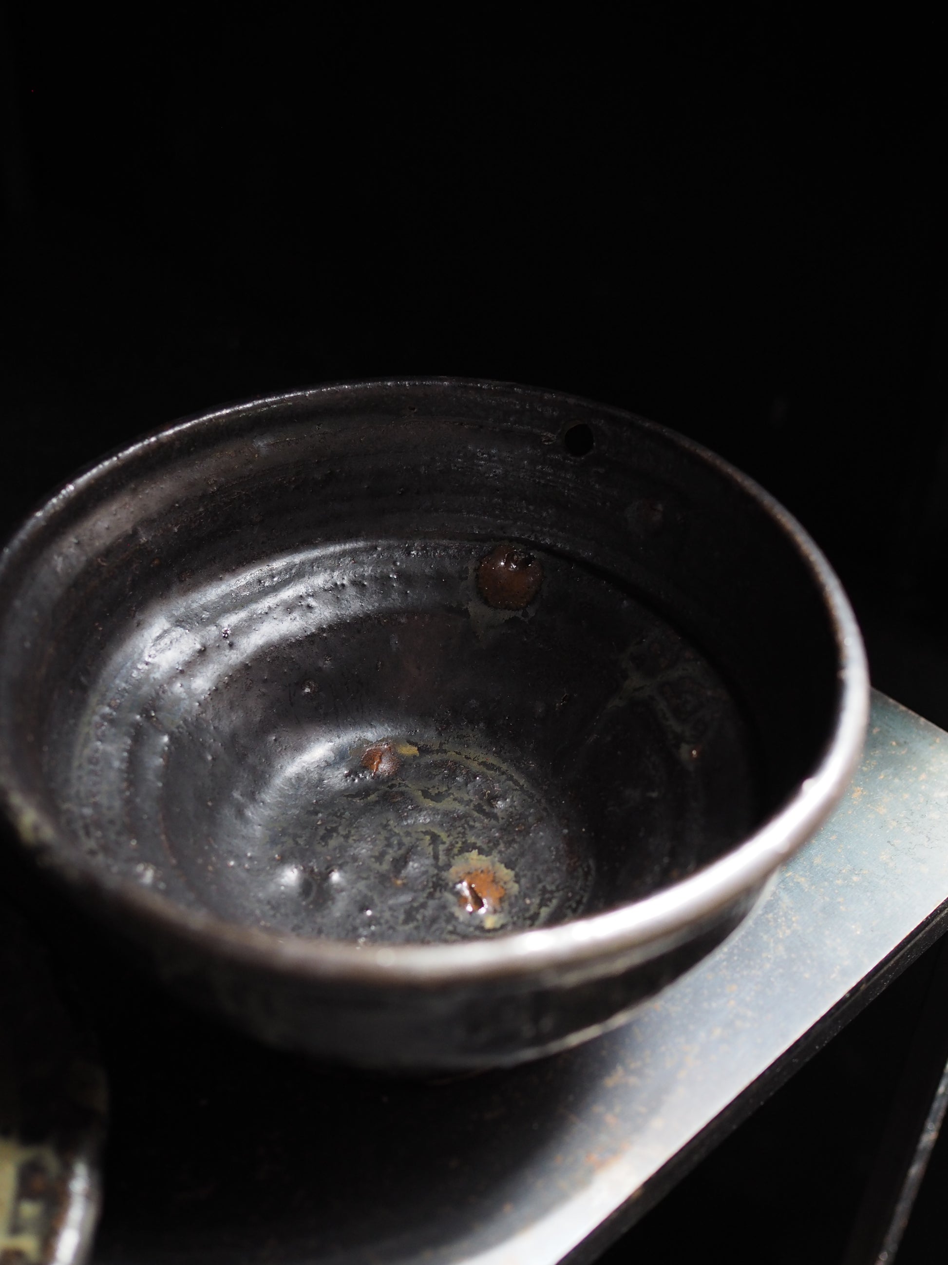 Stoneware 1300 degrees (Gas fired). Collectected wild clays and Manuka ash from the Coromandel peninsula, specifically Kūaotunu and Sailors Grave.The glaze is called Oil Skin. It is an iron glaze named after the durable black bush coat historically worn by hunters and trappers in NZ.