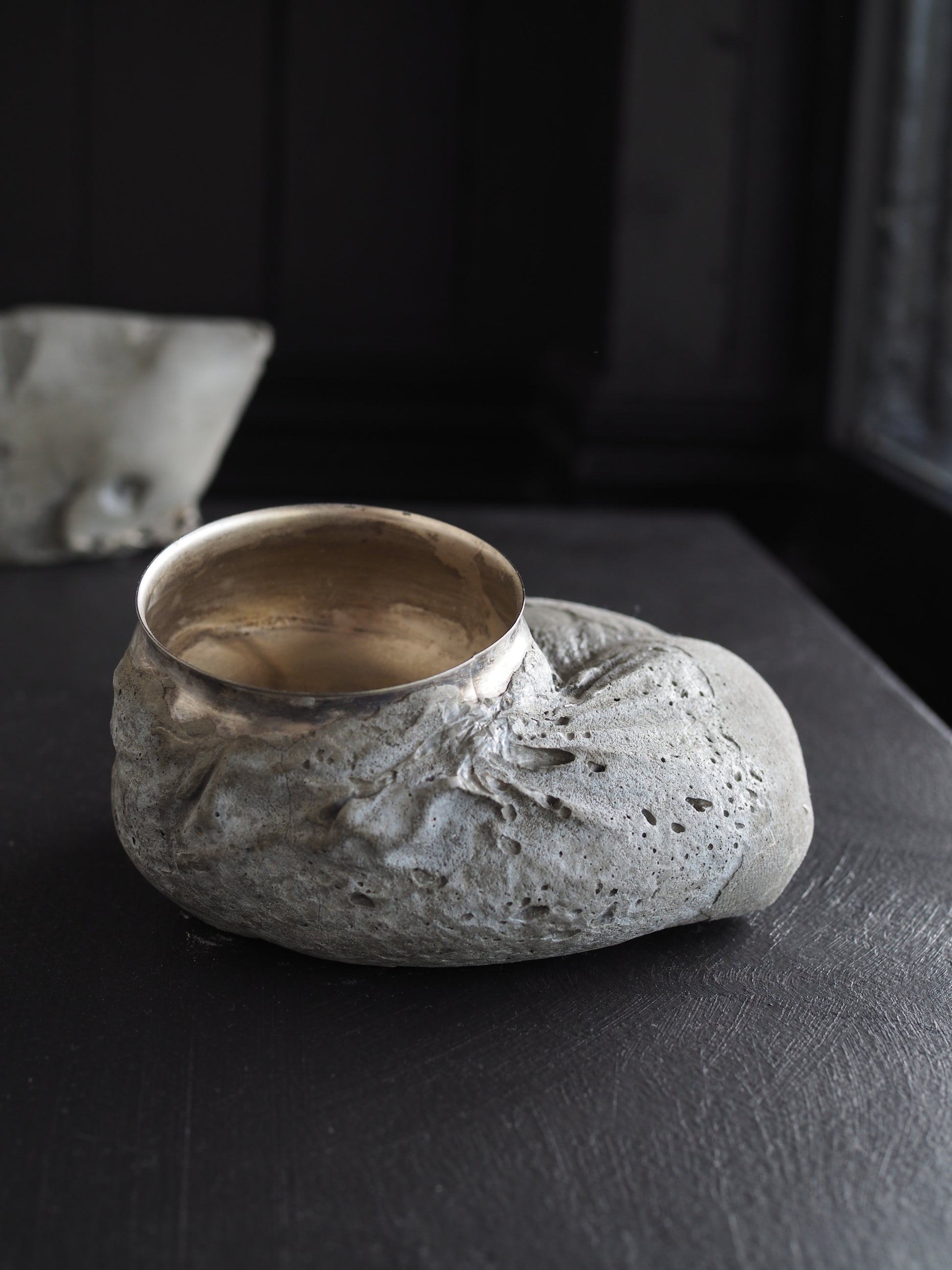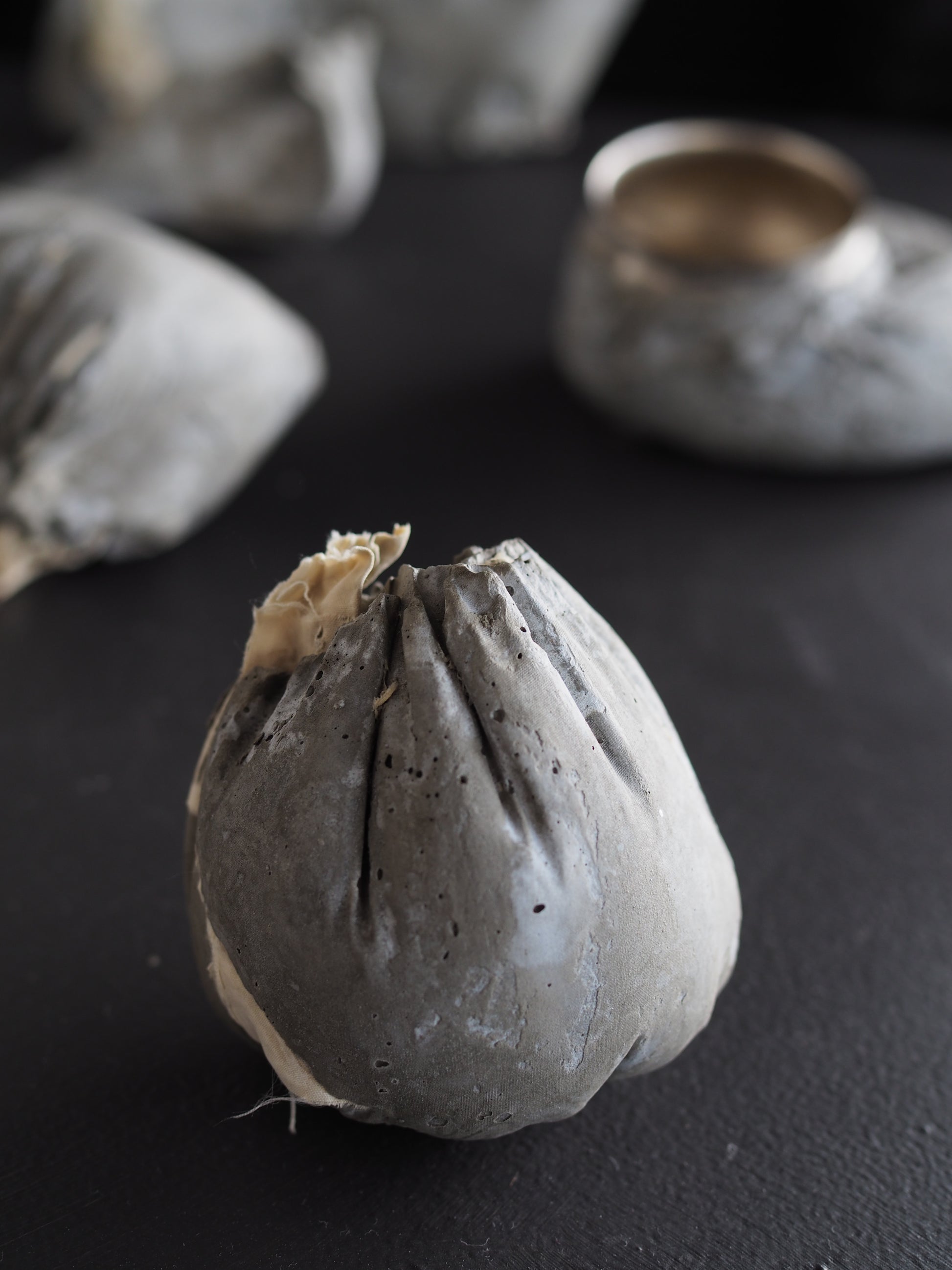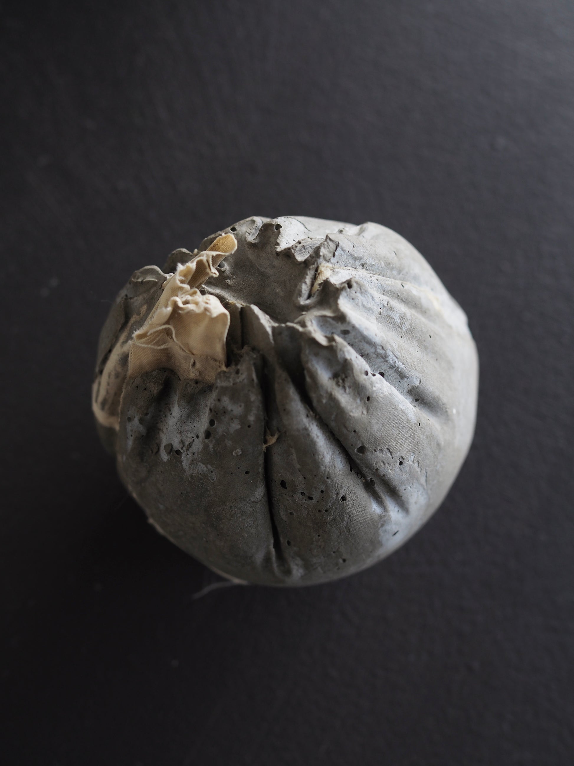 This particular piece is cast from clothes filled with treasures and familiar materials of the artist. The fragments of objects and air holes in the cement emerge beautifully, capturing the memories and ambient of fragility.