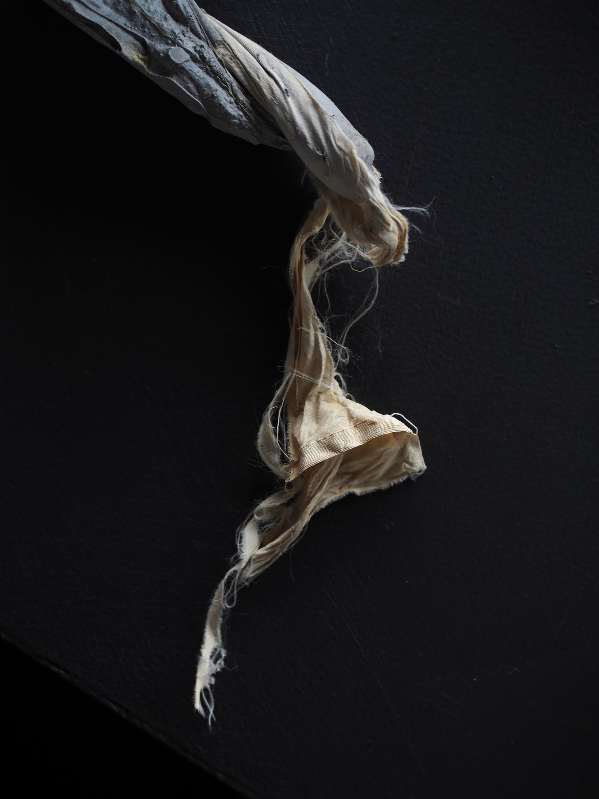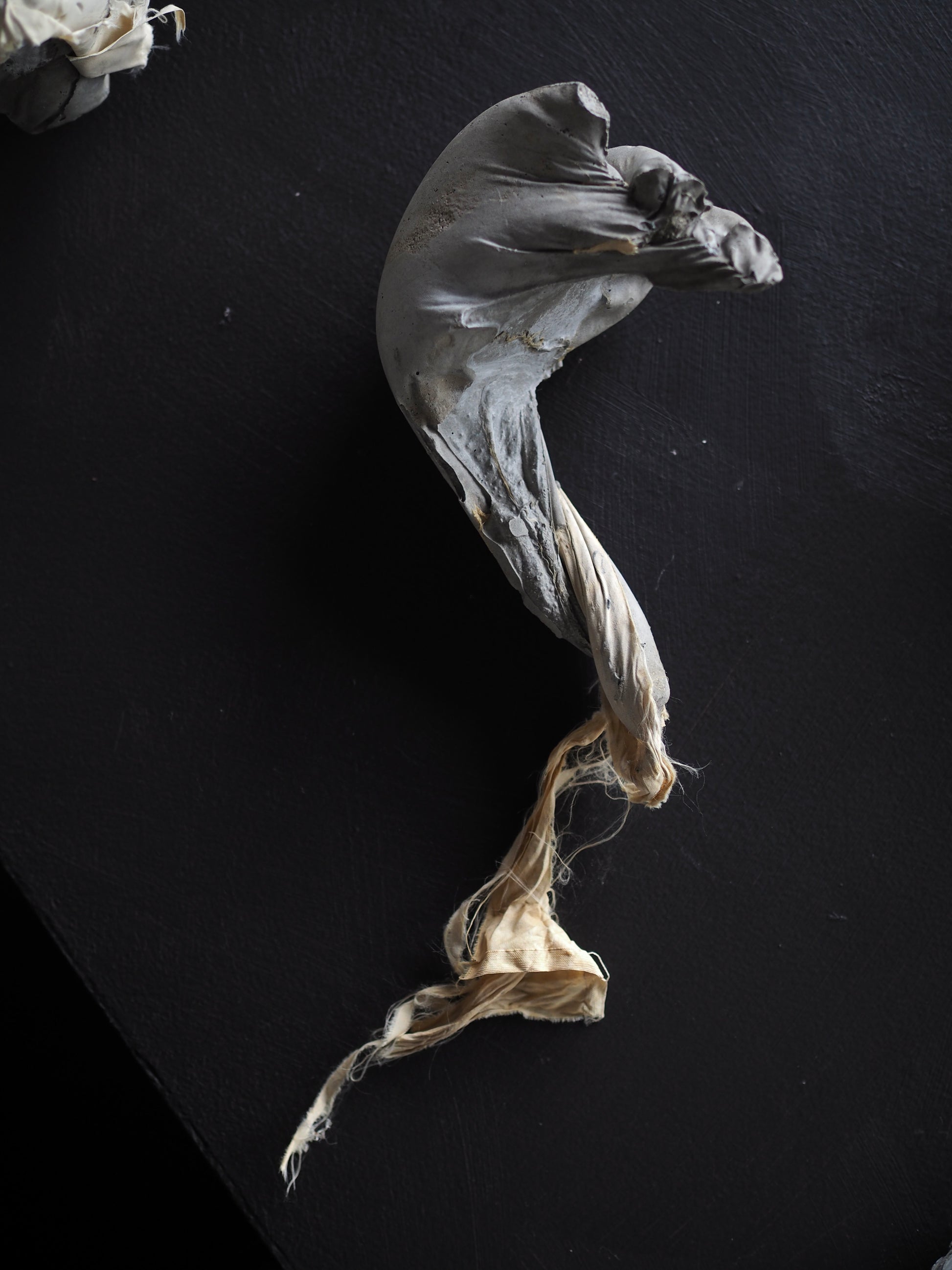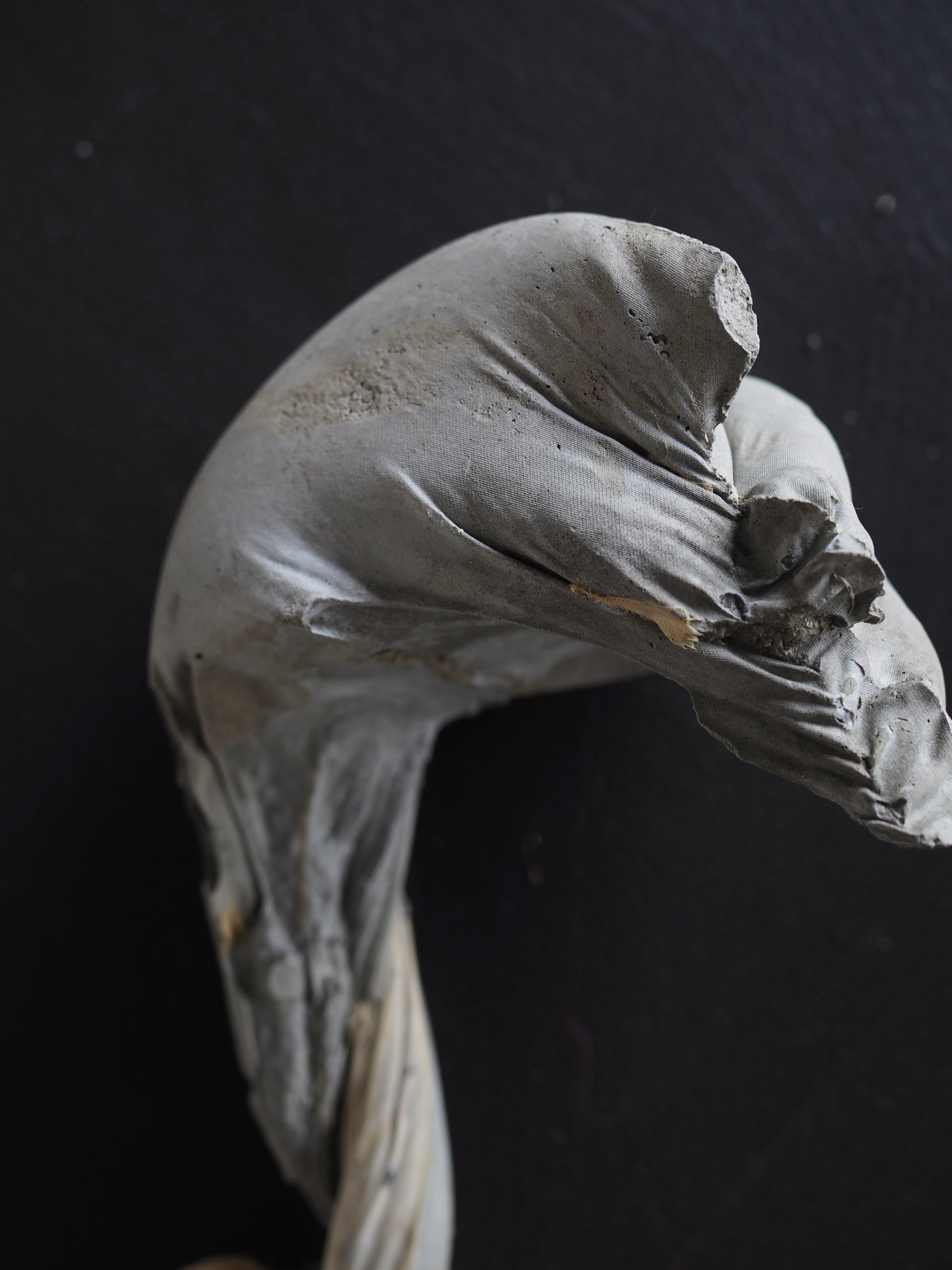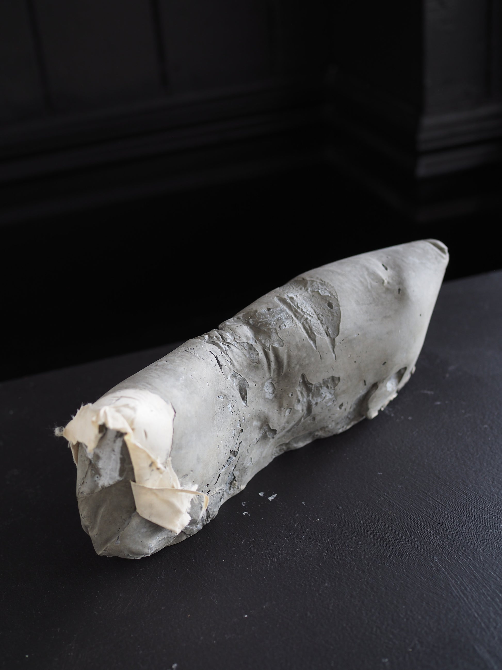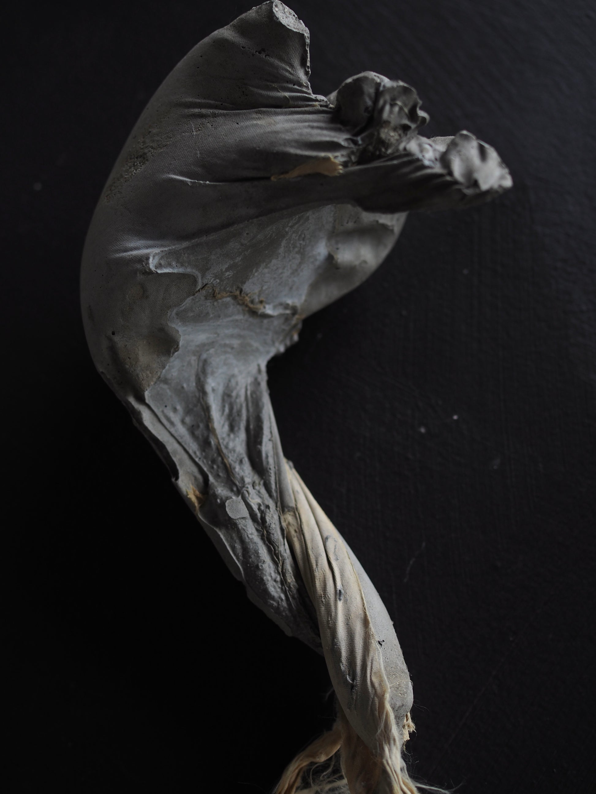 This particular piece is cast from clothes filled with treasures and familiar materials of the artist. The fragments of objects and air holes in the cement emerge beautifully, capturing the memories and ambient of fragility.