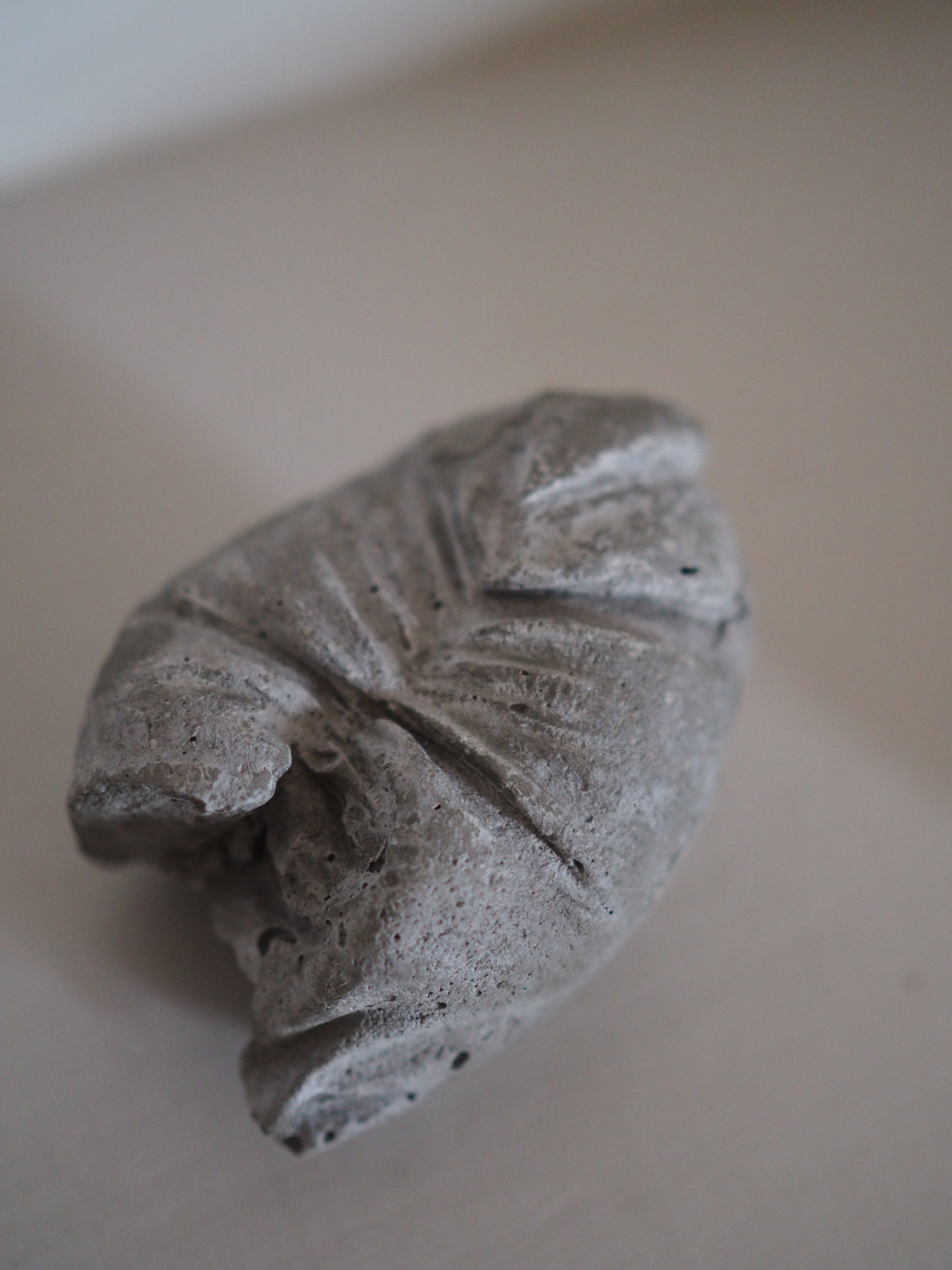 This particular piece is cast from clothes filled with treasures and familiar materials of the artist. The fragments of objects and air holes in the cement emerge beautifully, capturing the memories and ambient of fragility.