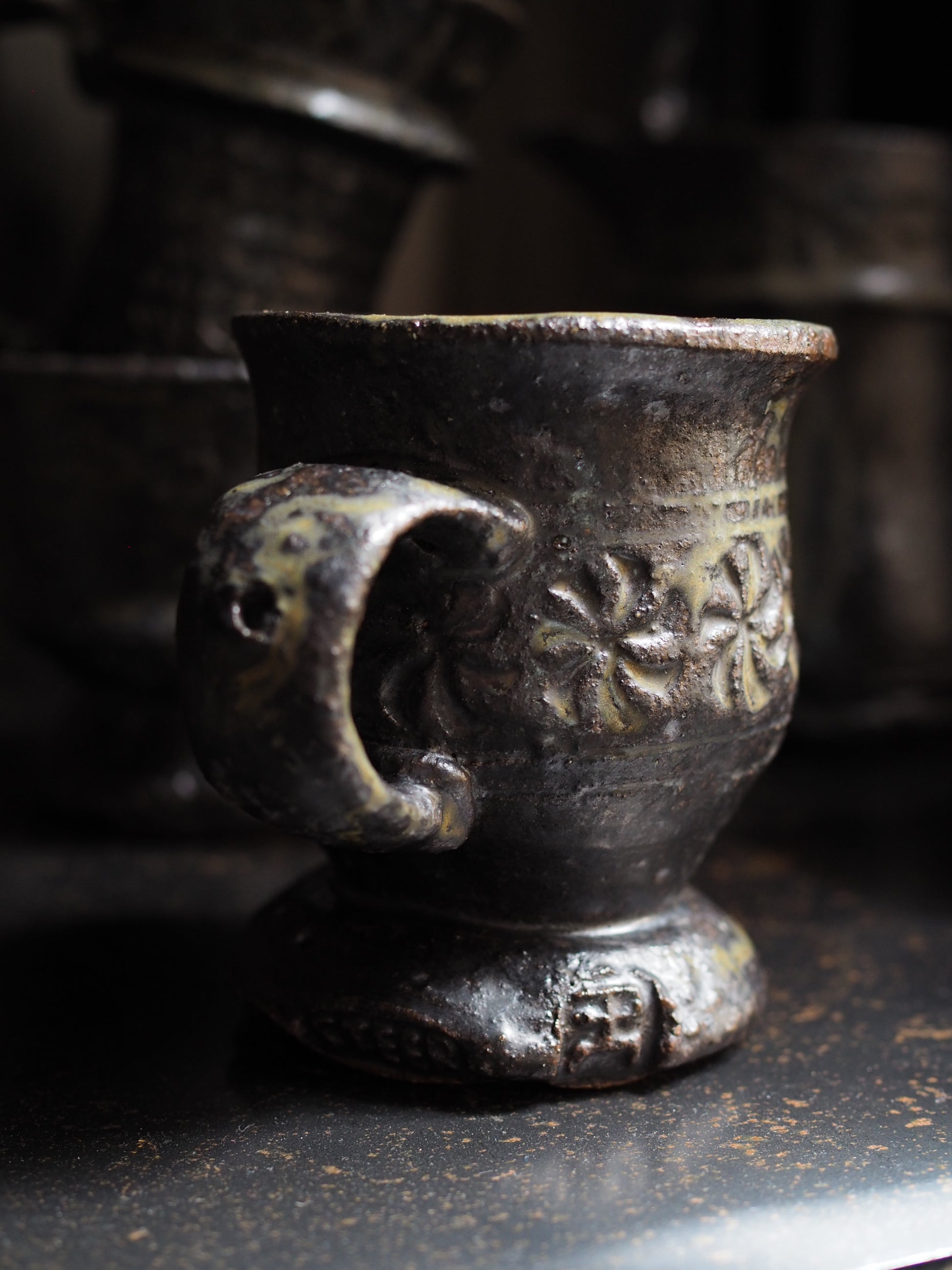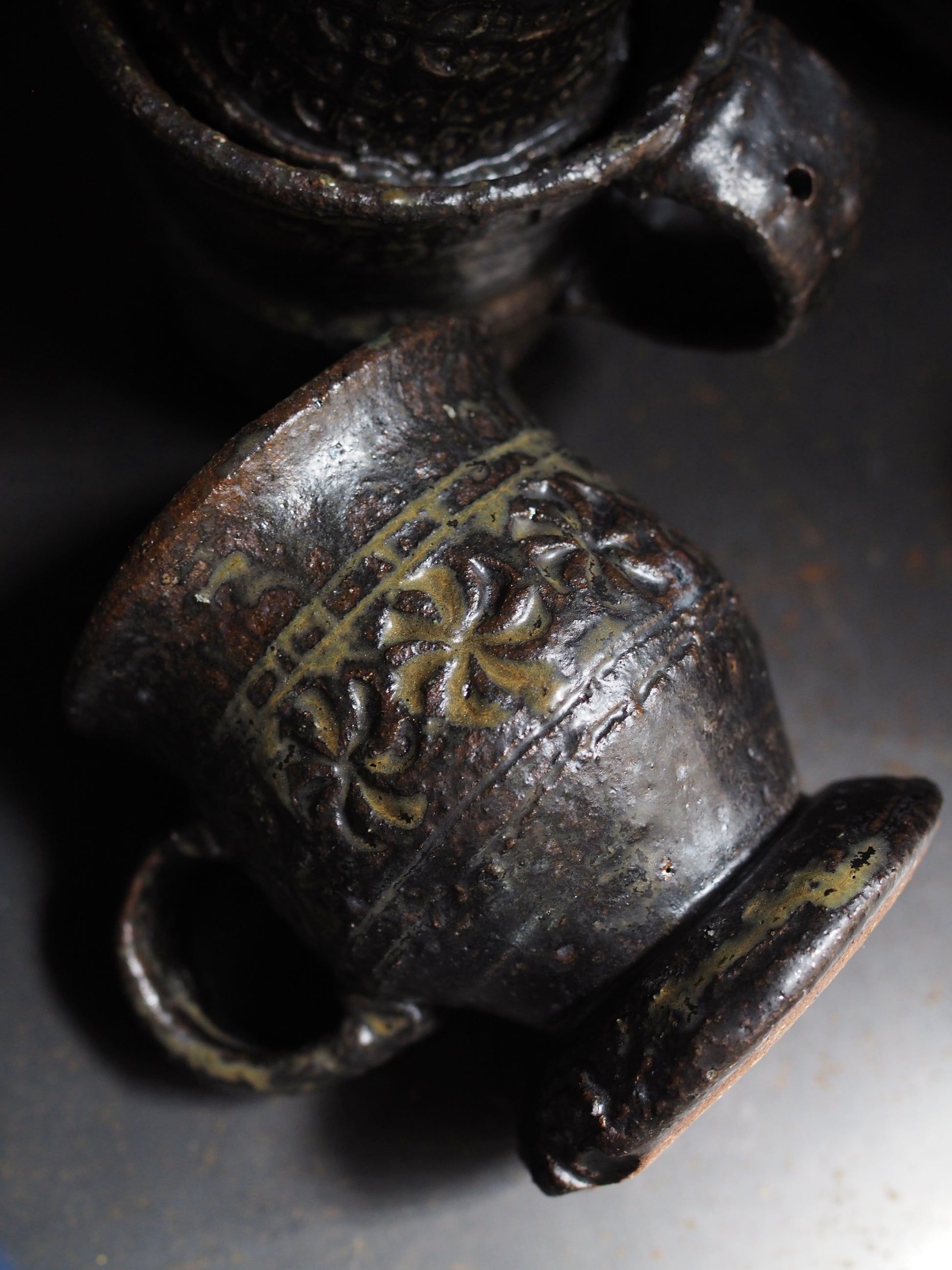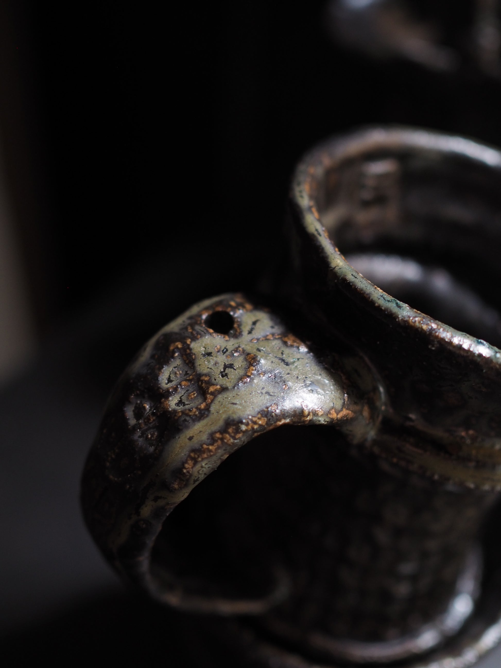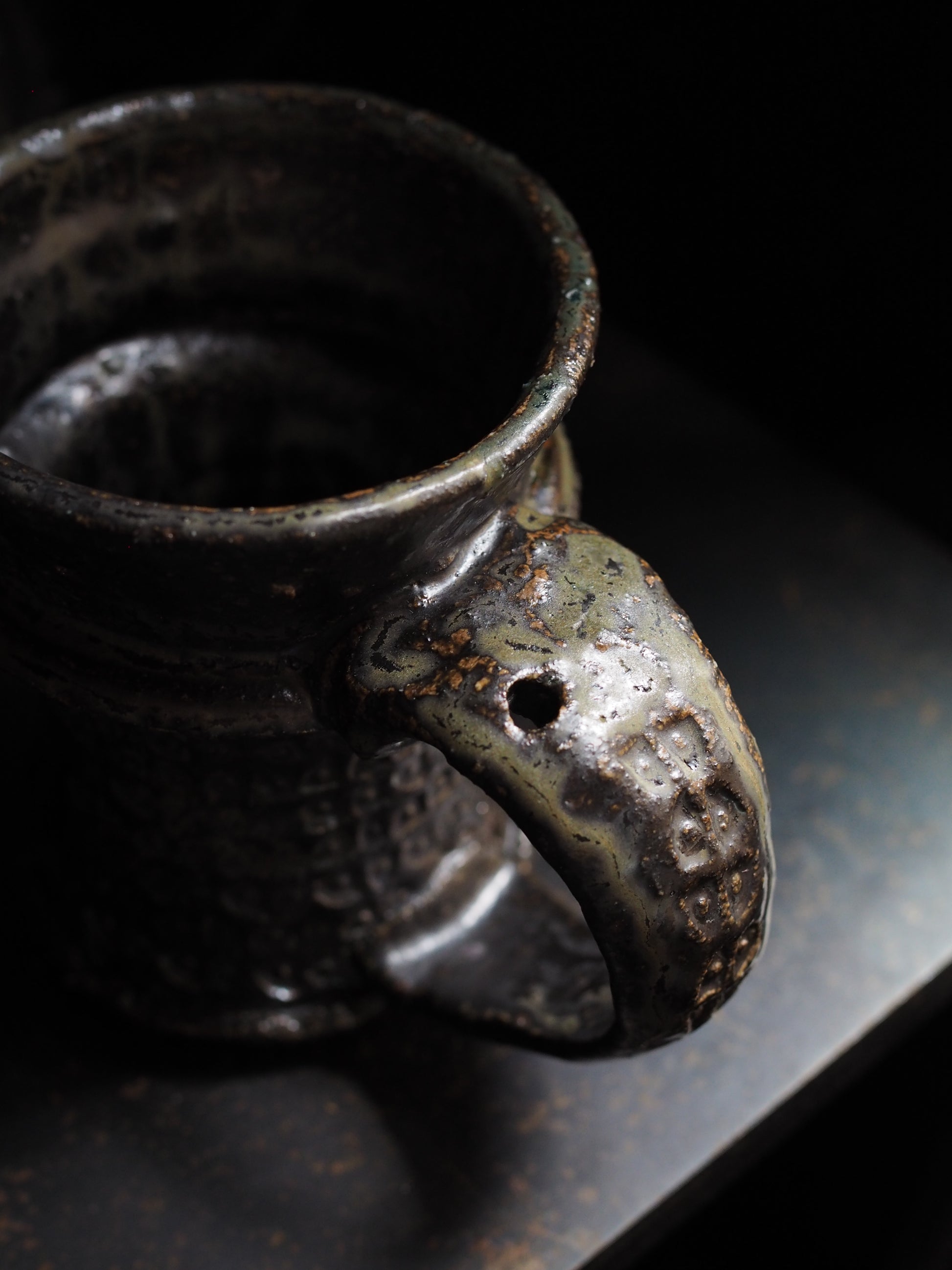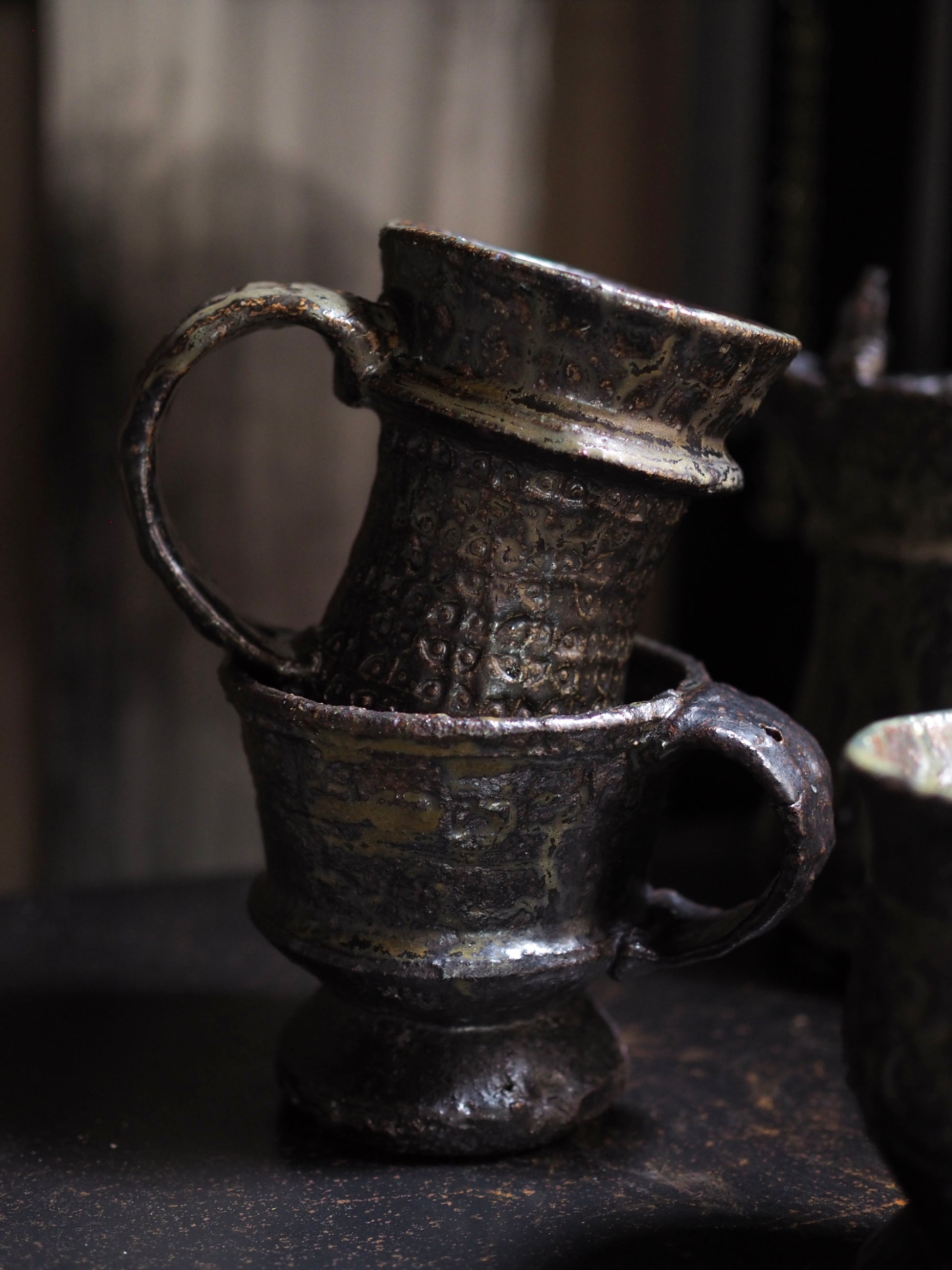 Stoneware 1300 degrees (Gas fired). Collectected wild clays and Manuka ash from the Coromandel peninsula, specifically Kūaotunu and Sailors Grave.The glaze is called Oil Skin. It is an iron glaze named after the durable black bush coat historically worn by hunters and trappers in NZ.