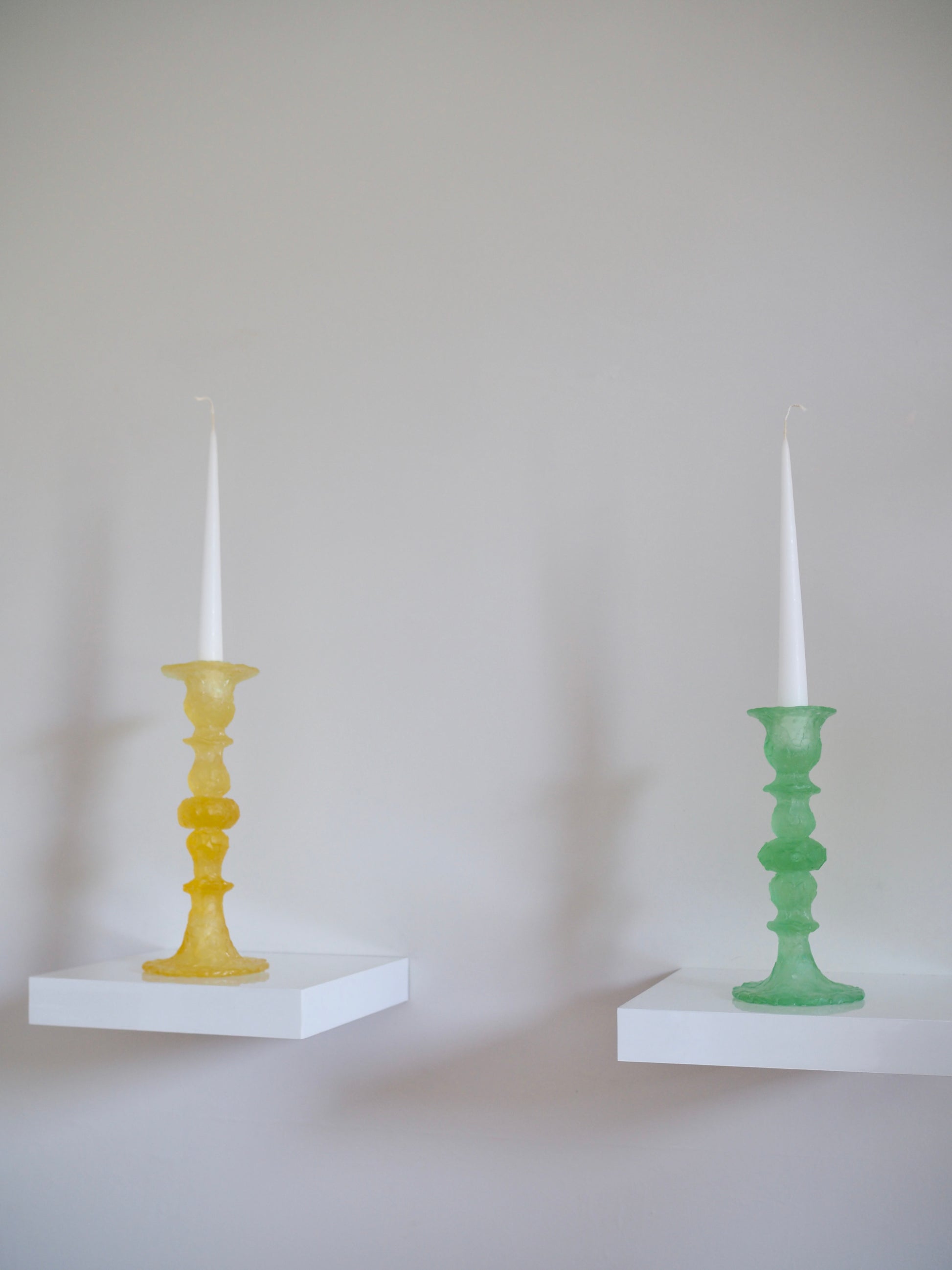 The wax pattern is sprues and coated inlayers of ceramic slurry which is fired in a gas kiln to harden the ceramic refractory and melt out the wax, leaving a negative space for the molten bronze to be poured into. The sprues are cut off and ground in the chasing process and sand blasted to ready the surface for patina which is finally sealed with wax.