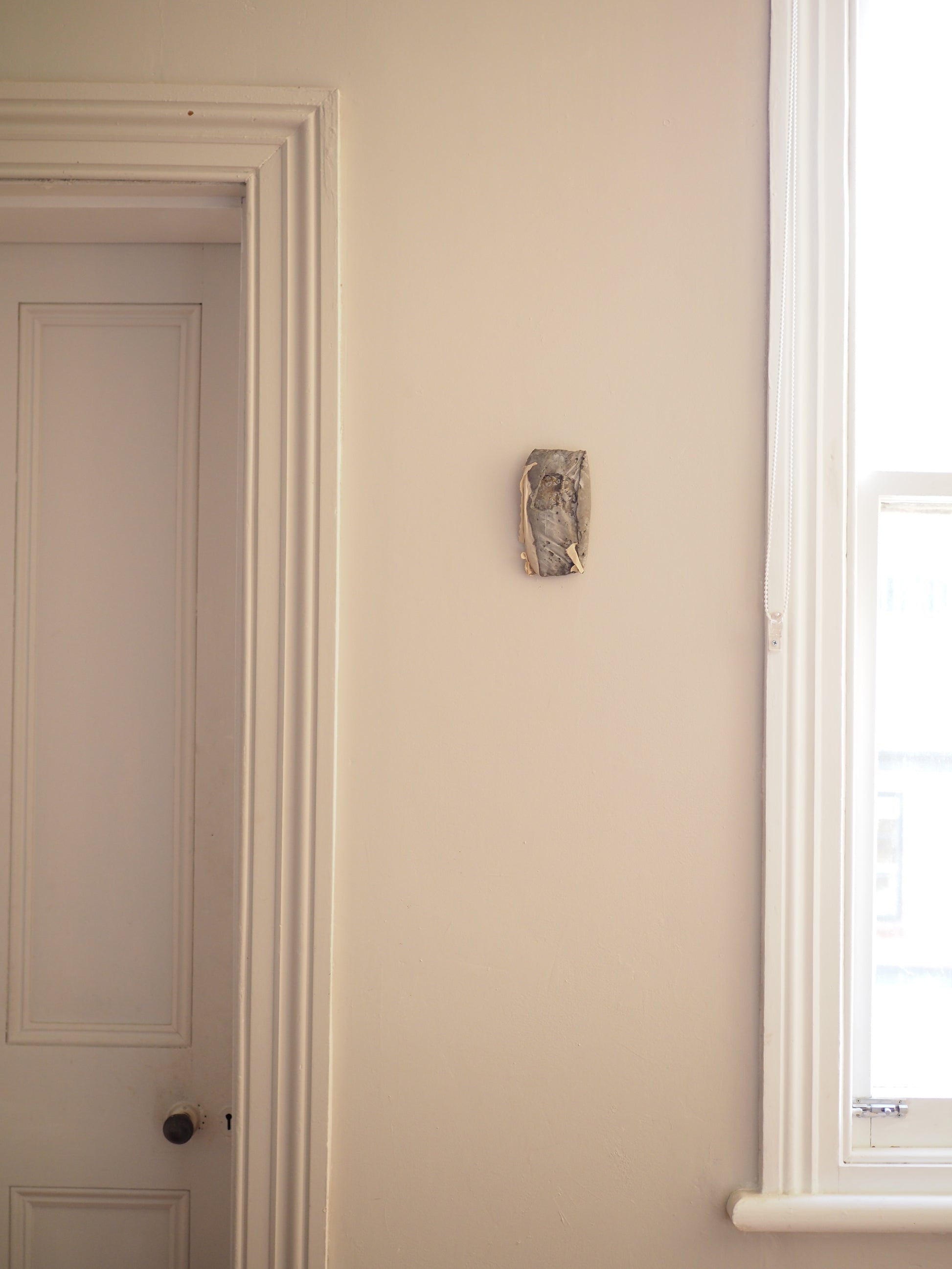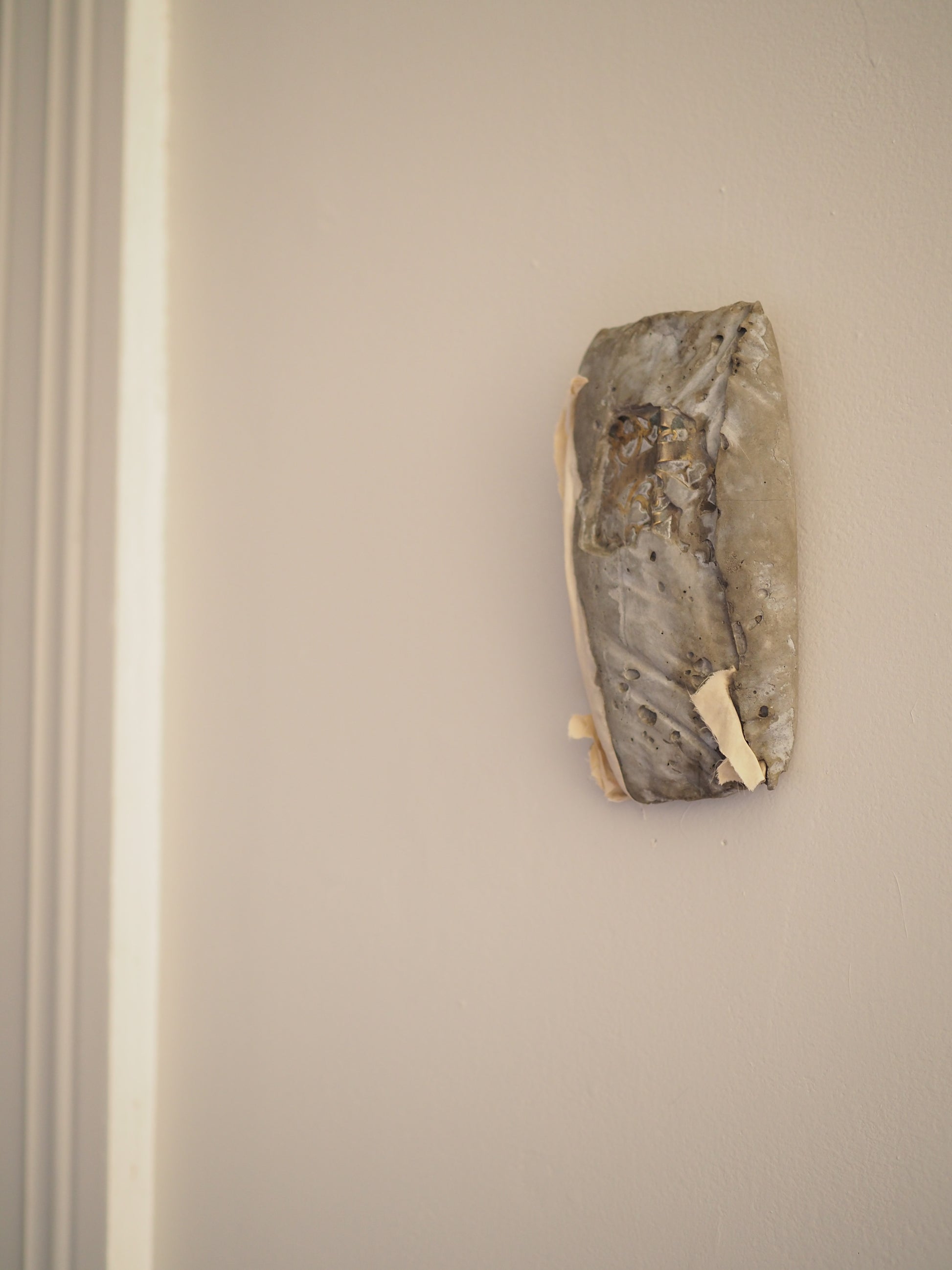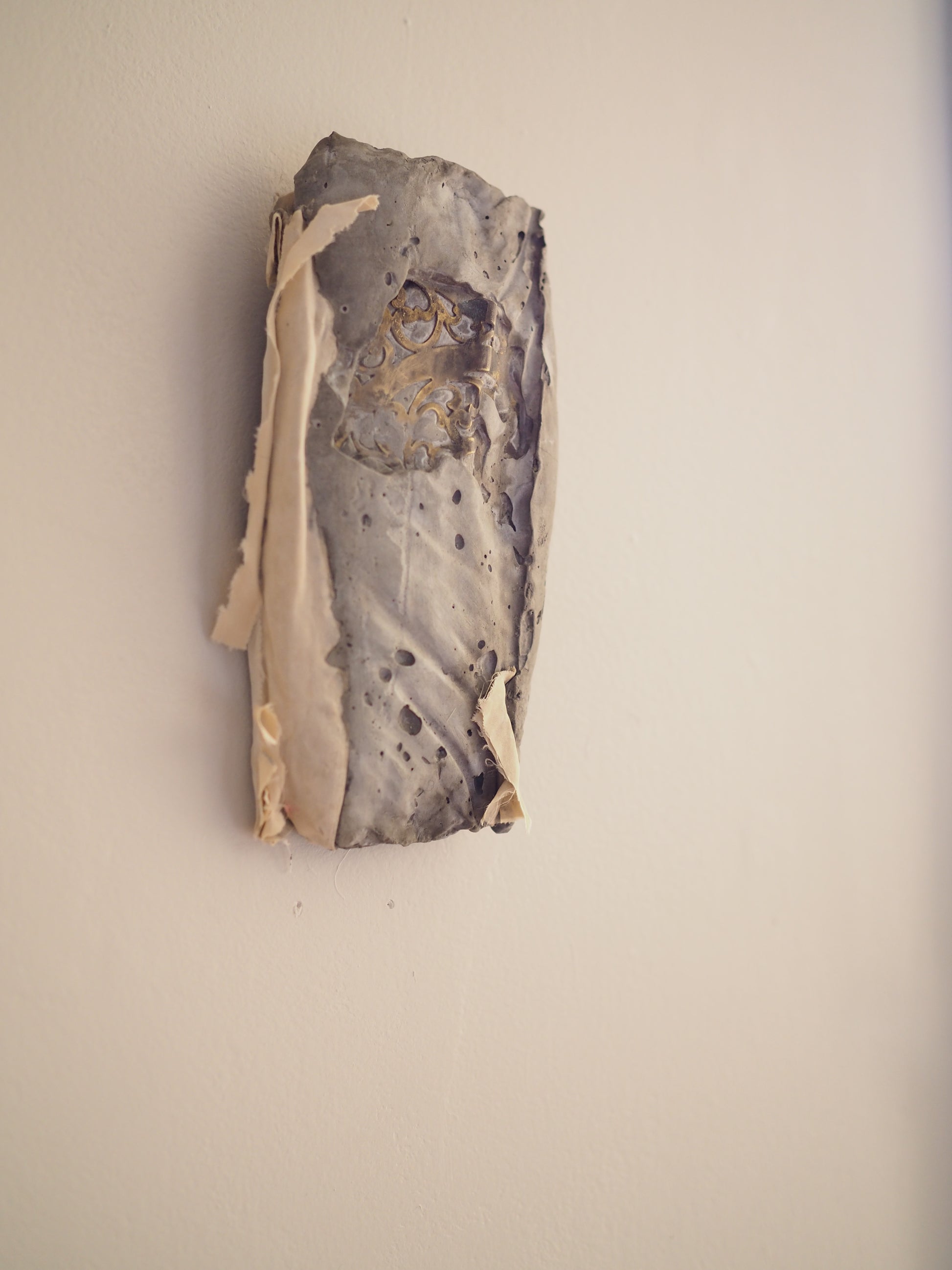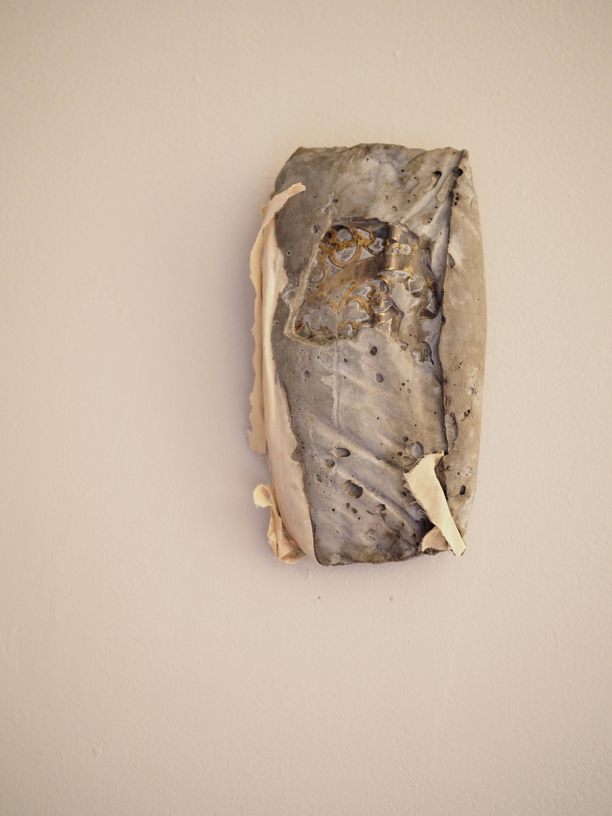 This particular piece is cast in a pocket of clothes filled with treasures and familiar materials of the artist. The fragments of objects and air holes in the cement emerge beautifully, capturing the memories and ambient of fragility.