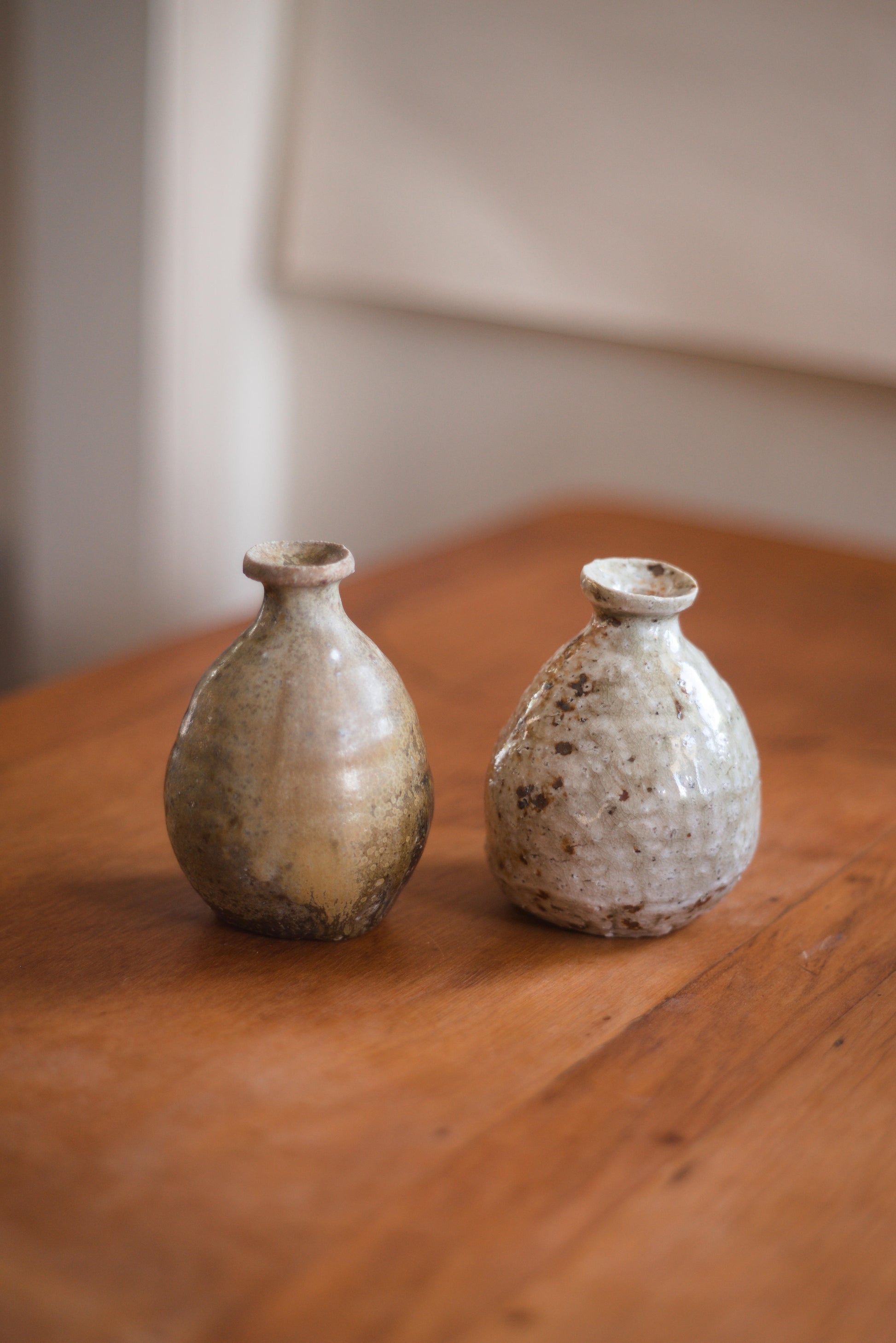 These are based on traditional form for pouring sake but can also be used as a vase. Stoneware clay woodfired in an anagama kiln for three days. Natural ash glaze as a result of the firing process.