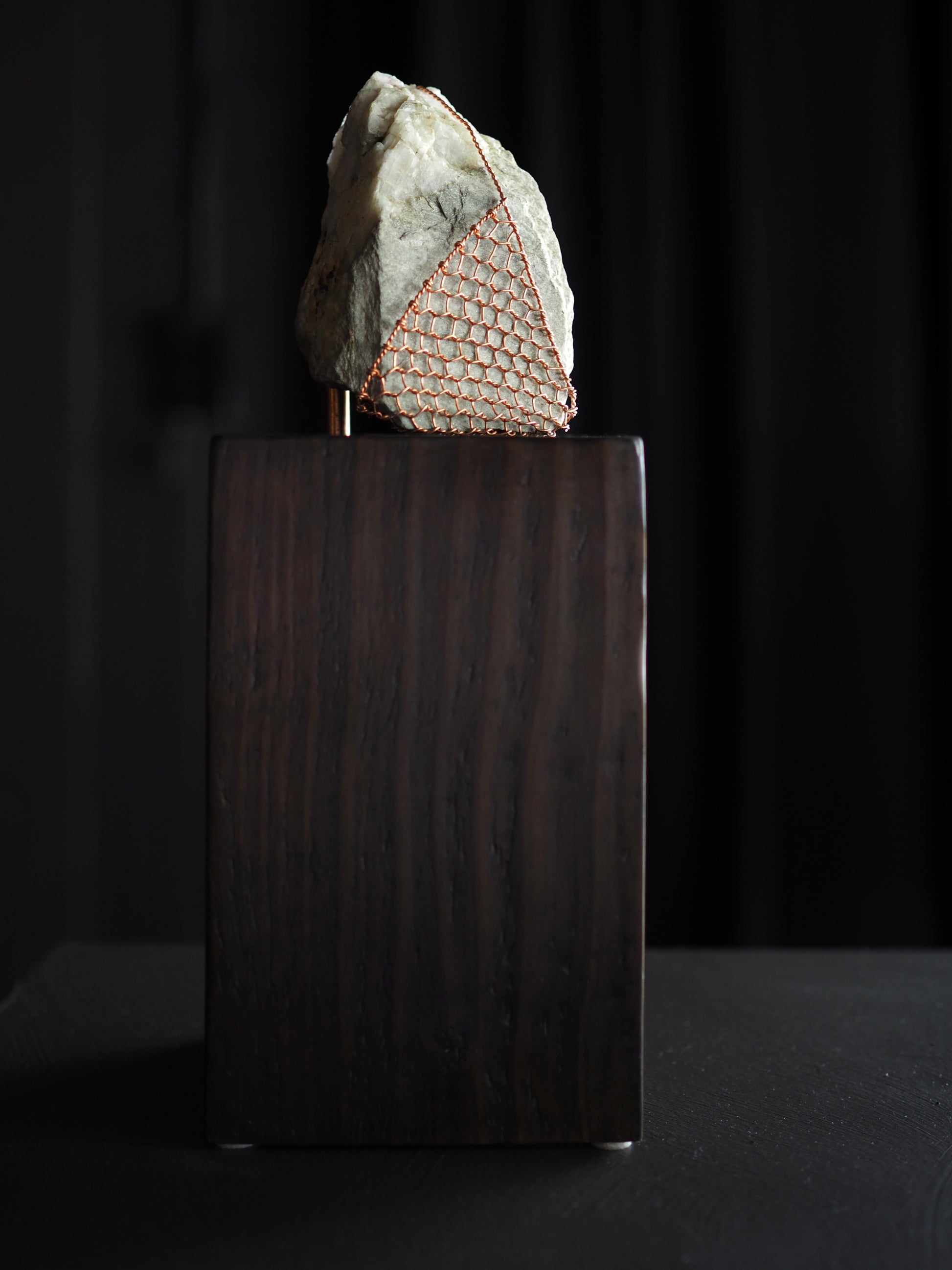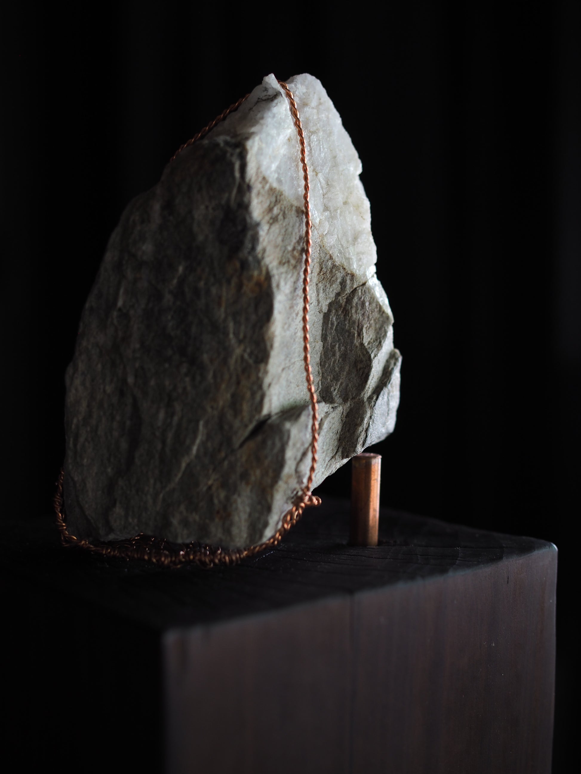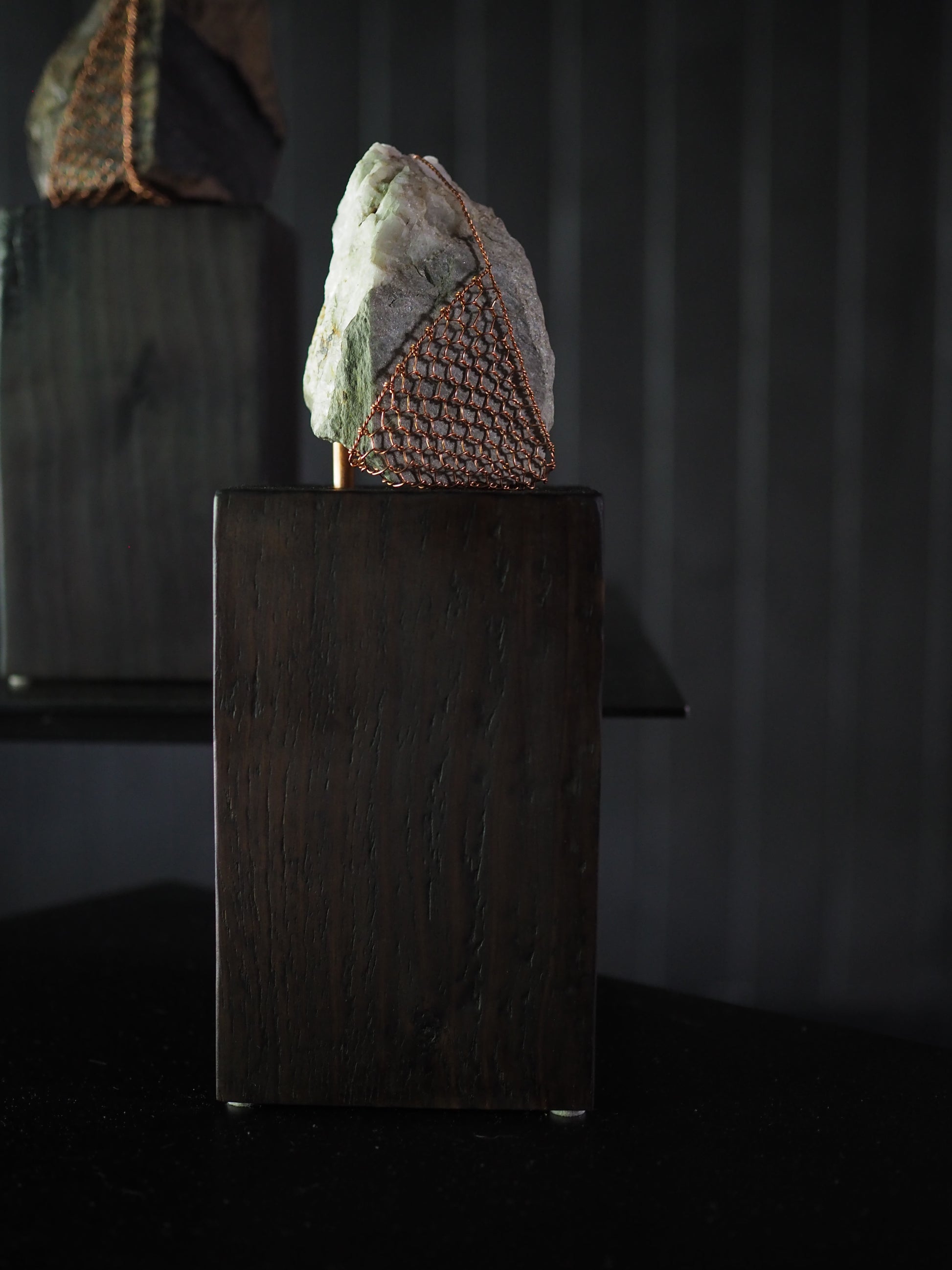 Materials: Rock sourced from Wanaka shoreline,Te-ami copper weaving, balanced on 3mm copper rod,Macrocarpa burnt & polished plinth finished with antique wax