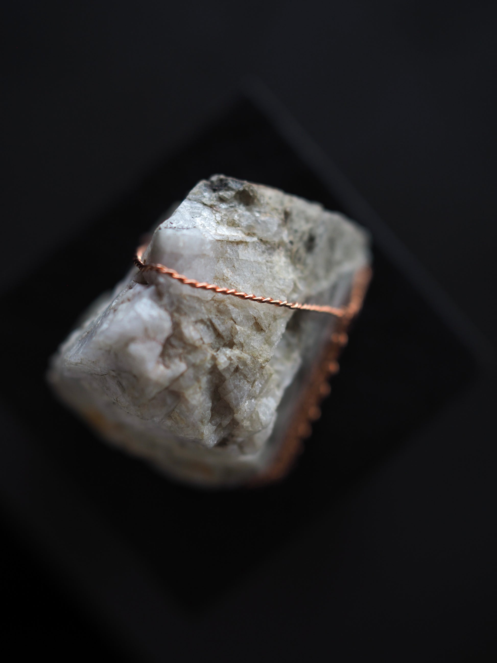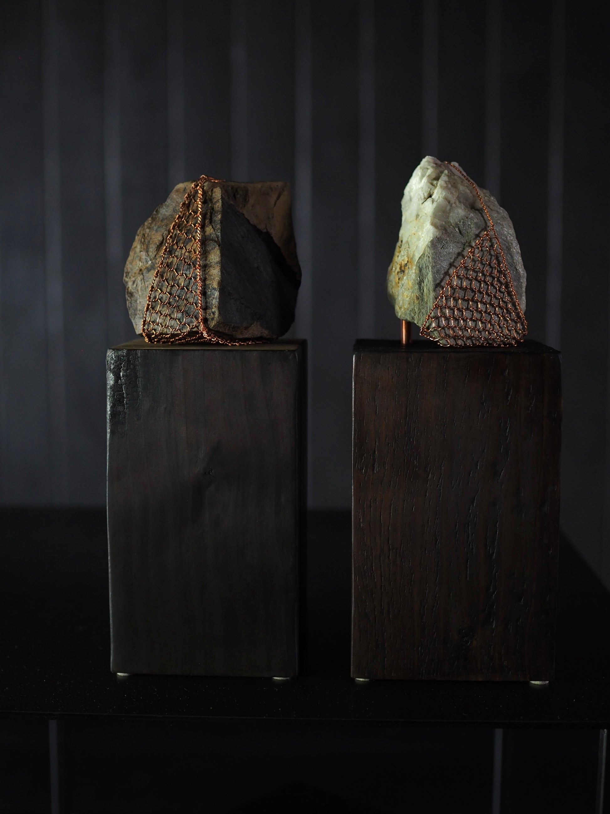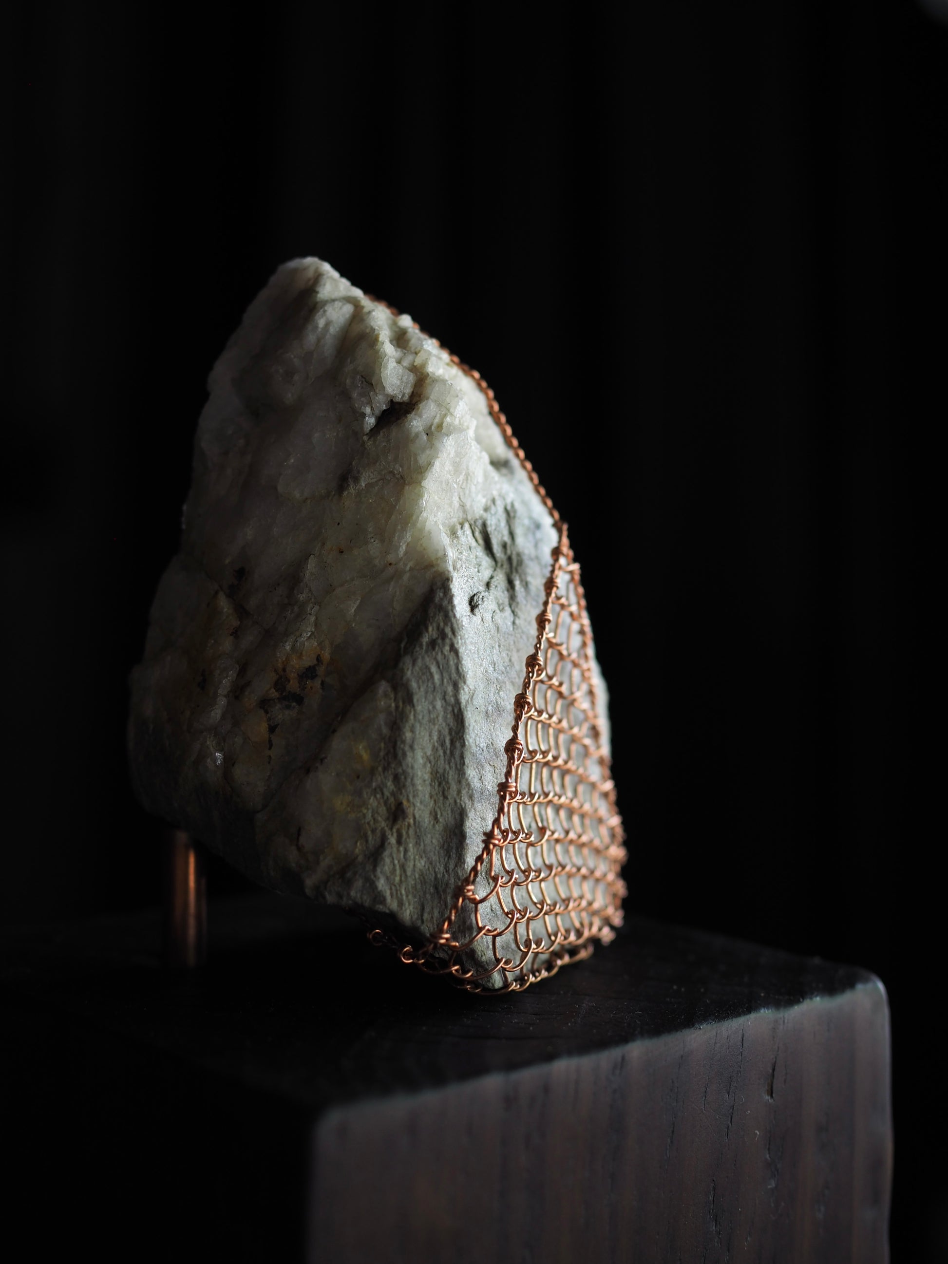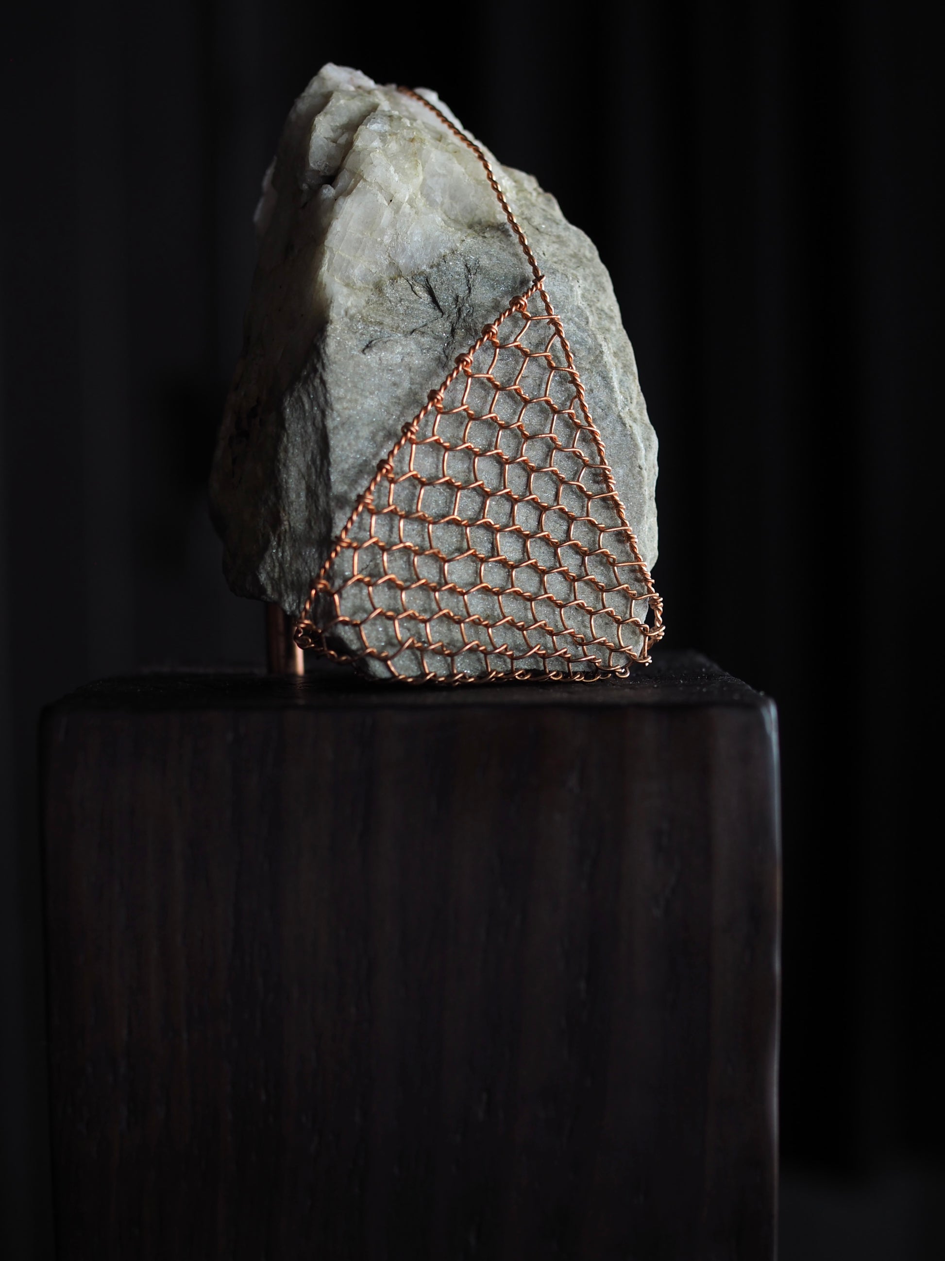 Materials: Rock sourced from Wanaka shoreline,Te-ami copper weaving, balanced on 3mm copper rod,Macrocarpa burnt & polished plinth finished with antique wax
