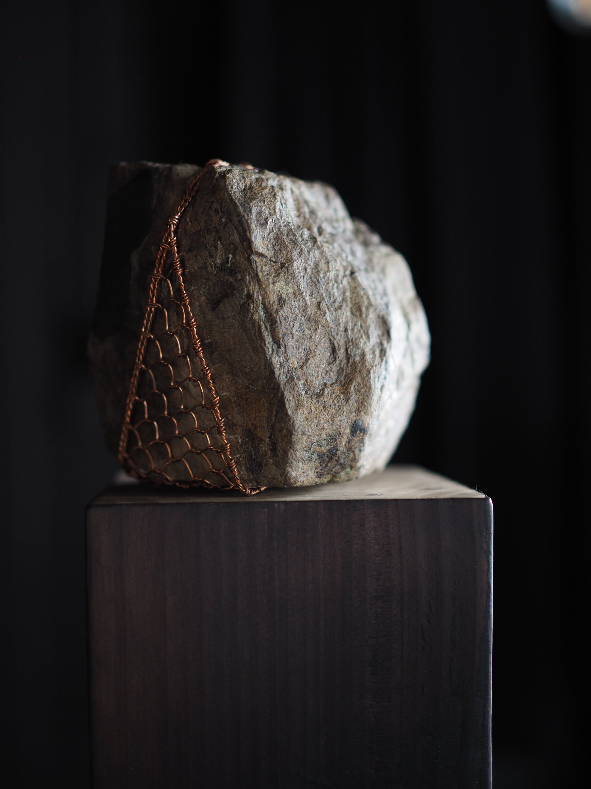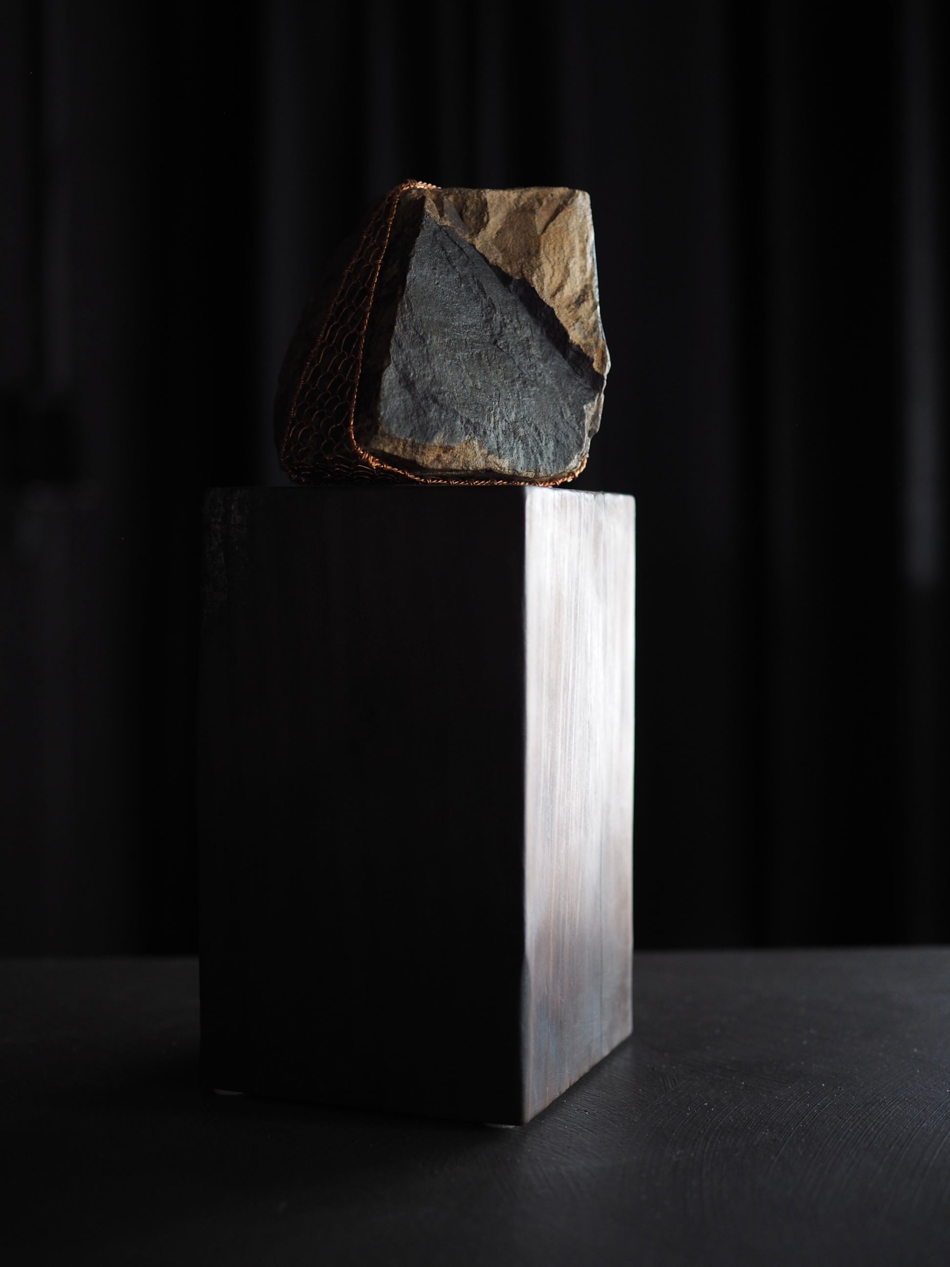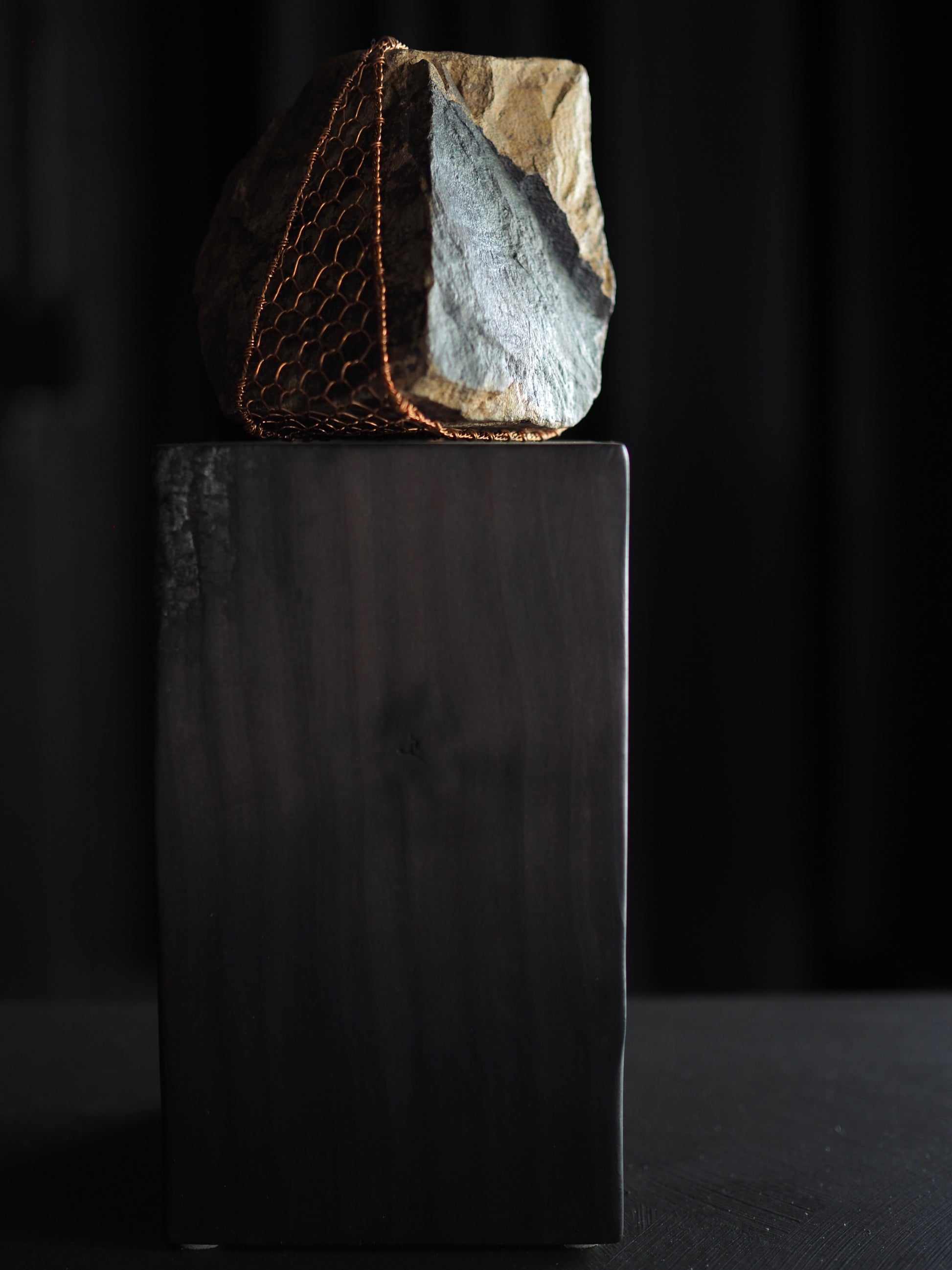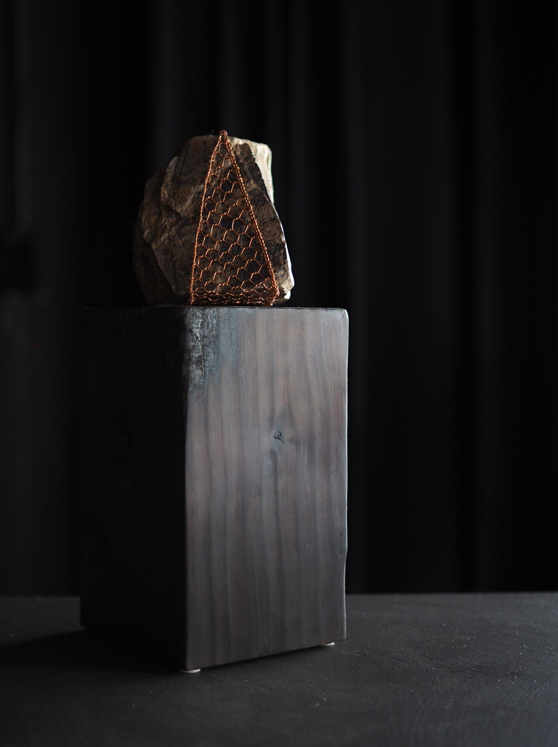 Materials: Rock sourced from Wanaka shoreline. Te-ami copper weaving, black stain on angled face,kintsugi detailing, Macrocarpa burnt & polished plinth finished with antique wax