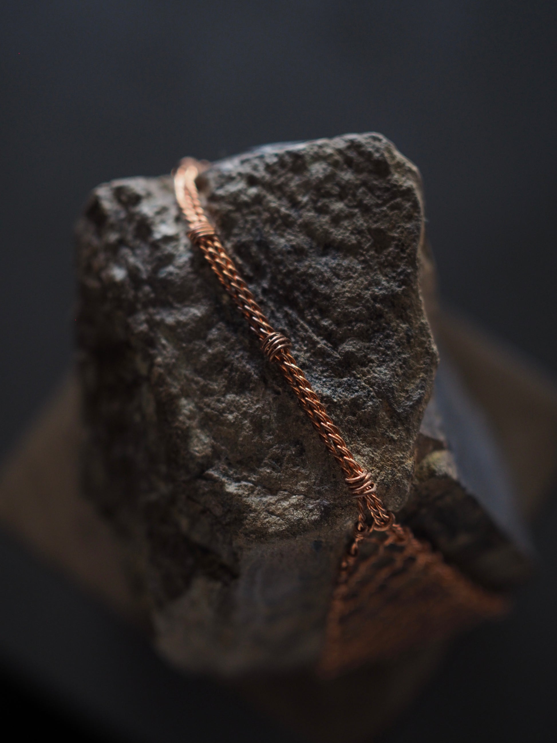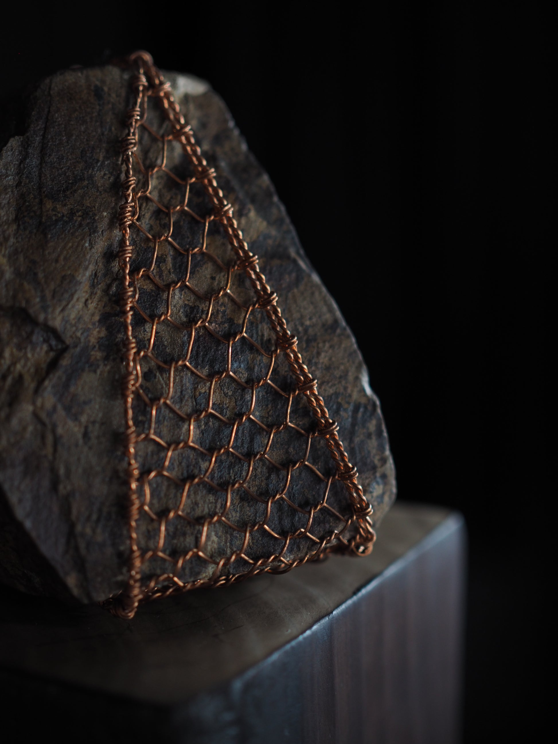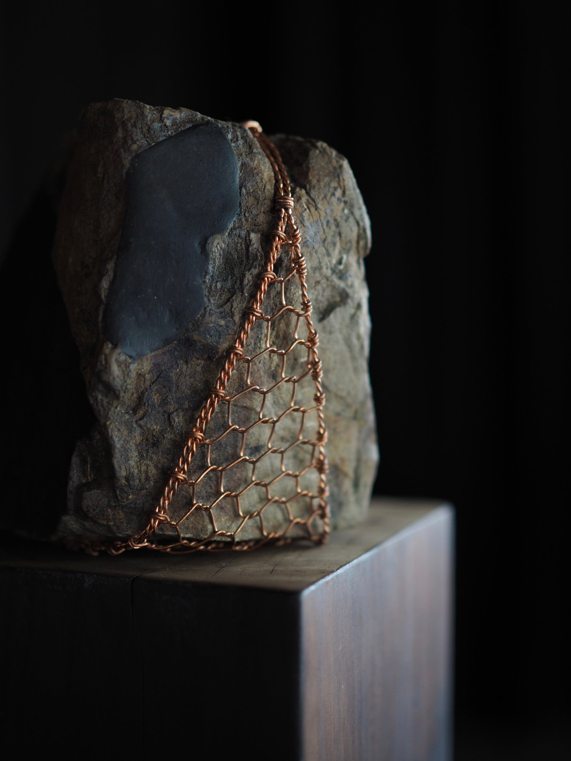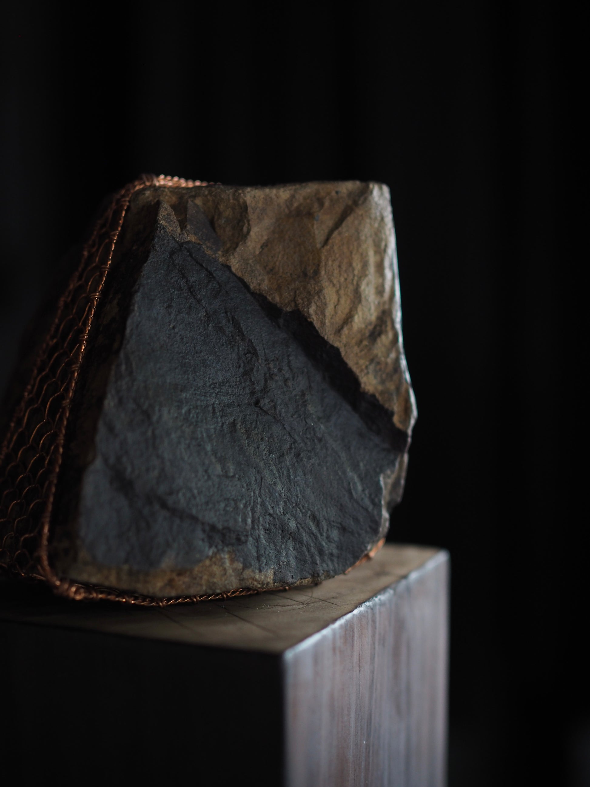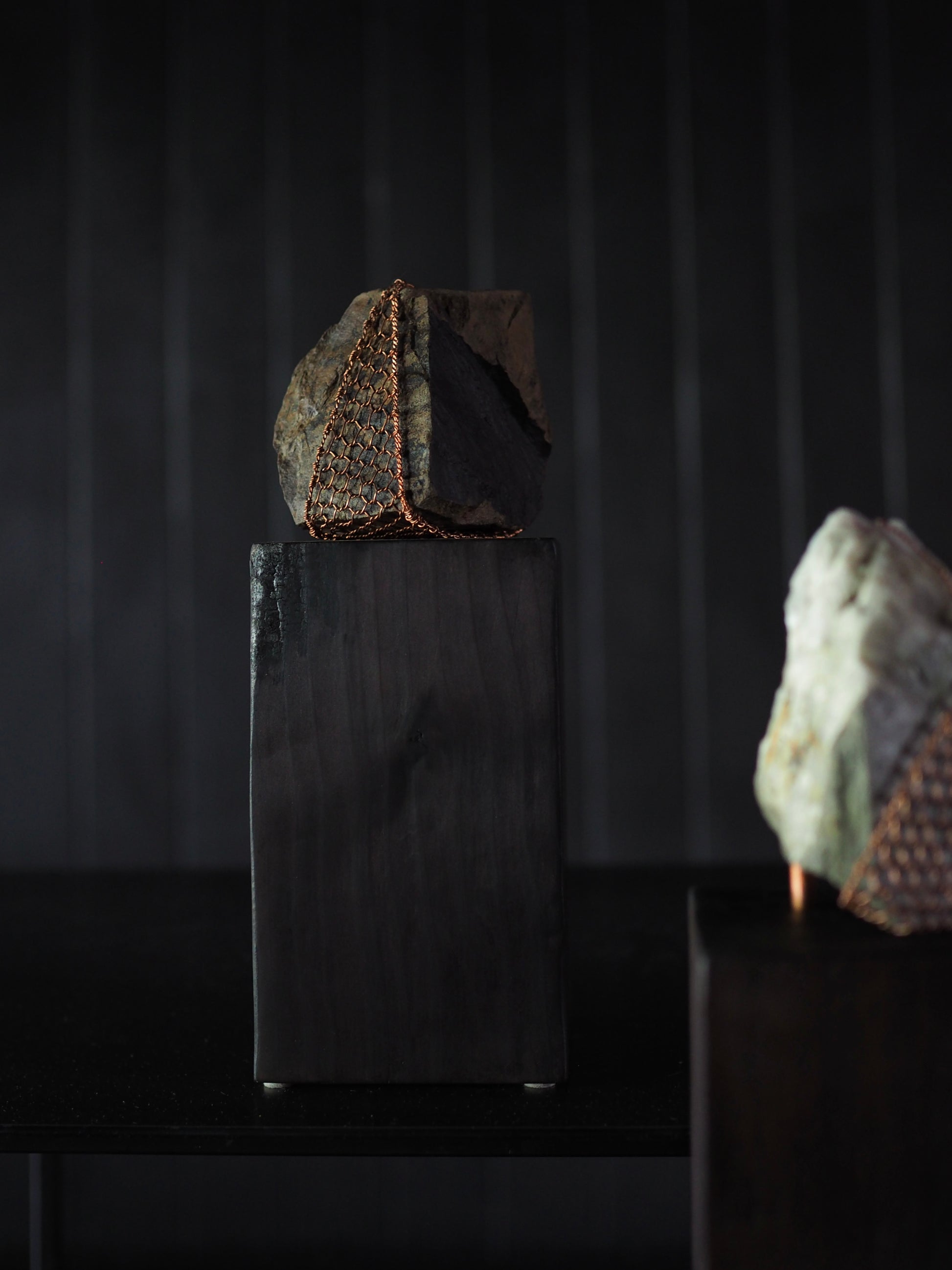 Materials: Rock sourced from Wanaka shoreline. Te-ami copper weaving, black stain on angled face,kintsugi detailing, Macrocarpa burnt & polished plinth finished with antique wax