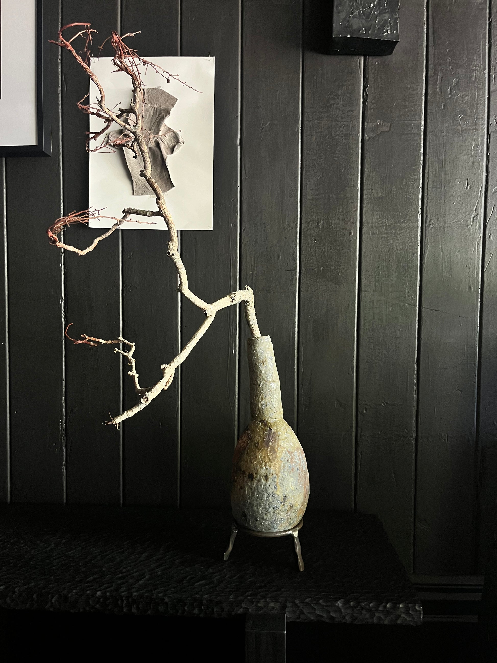 The handbuilt form is inspired by gourds, one of the oldest vessels. Stoneware clay woodfired in an anagama kiln for three days. Natural ash glaze as a result of the firing process. Steel stand made using recycled materials.